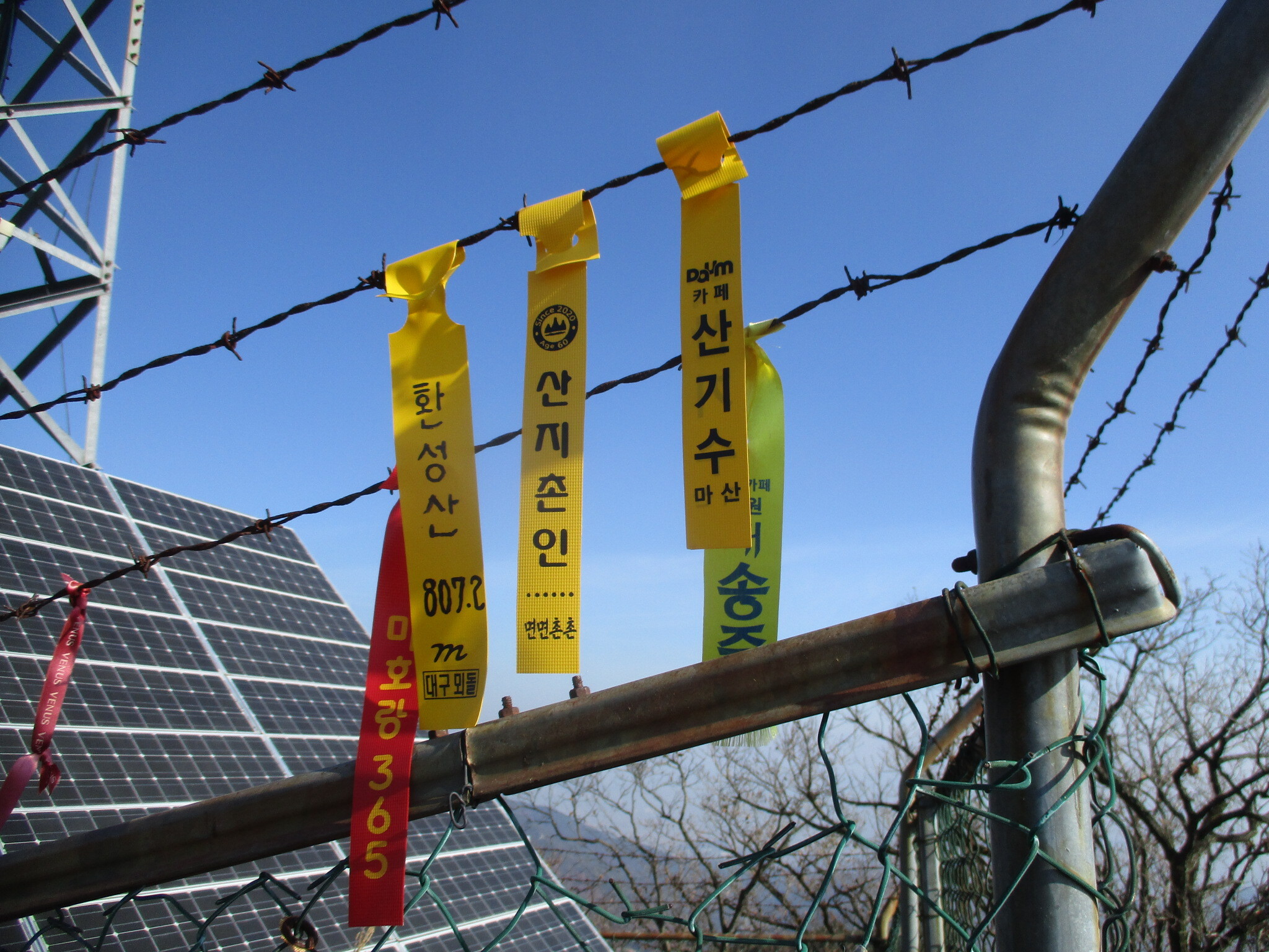 고도가 쪼매 틀리는 정상석은 안직 안고치났네!~ 무인산불초소 철조망에 걸리가 있는 표지기 여패다 뫼들 고도 표지기를