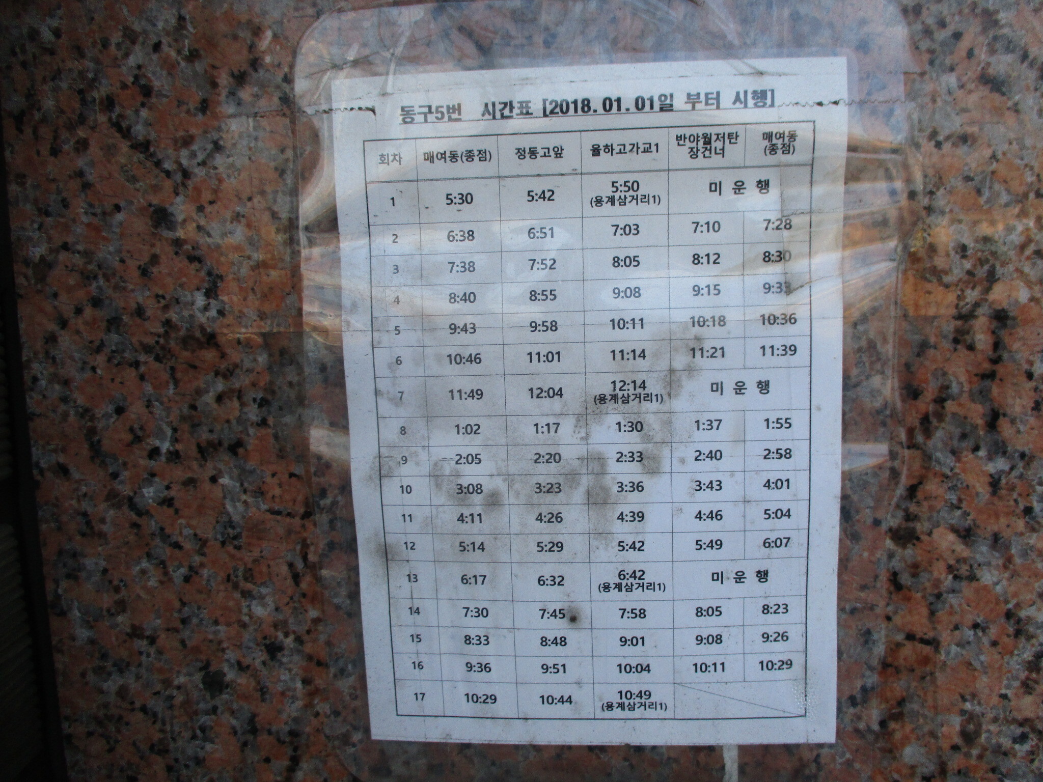 전날 인터넷을 검색해보이 동구5번 버스 첫차는 오전 6시 38분이고 배차 간격은 63분이라꼬 되있시 이론상으로 계산해보마