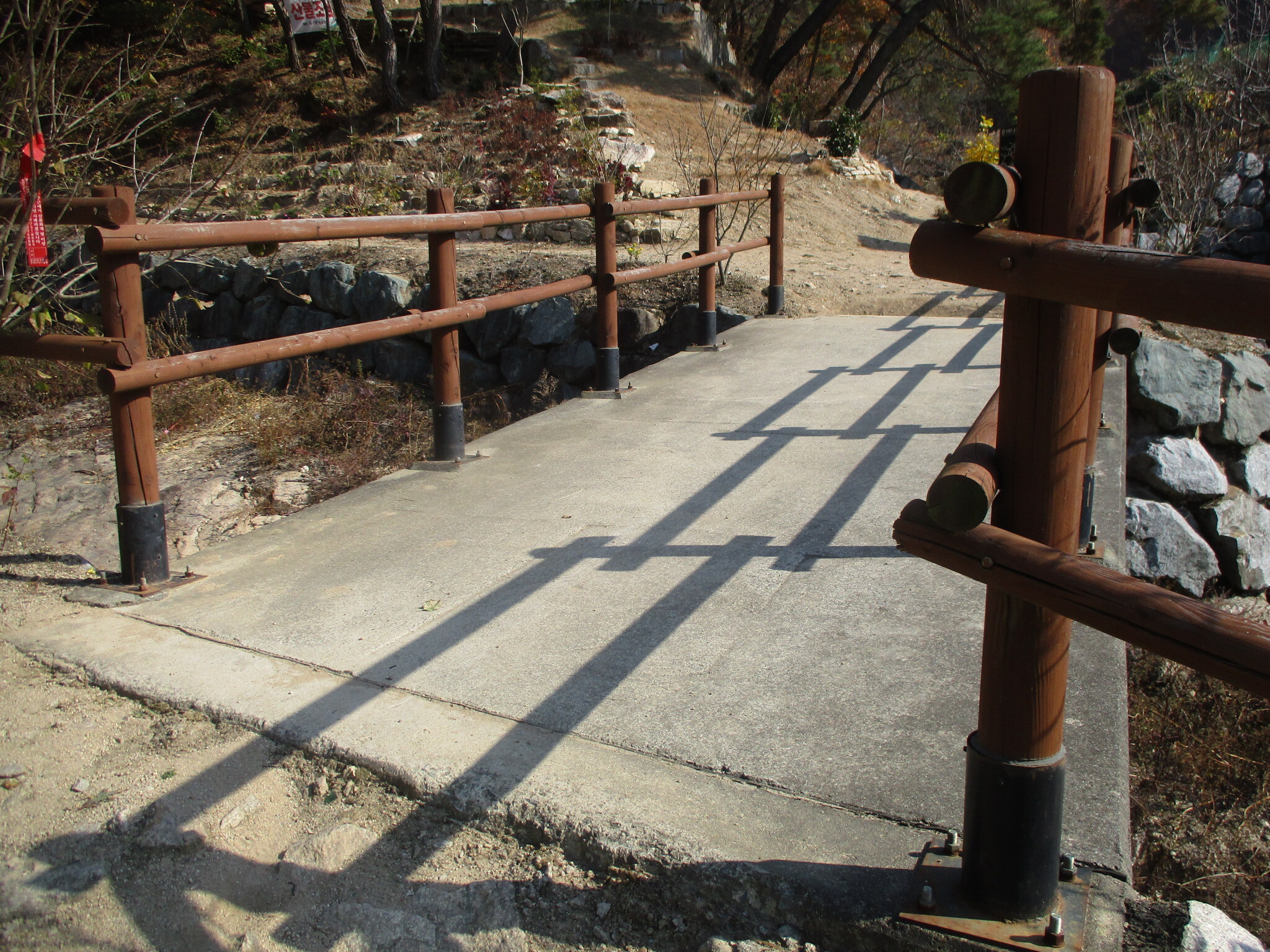 사각 정자에 안자가 산행 준비를 하고 오른쪽 세멘다리로 초례봉 올라가는 길을 지나쳐 터덜터덜 올라서면 매여교를 지나