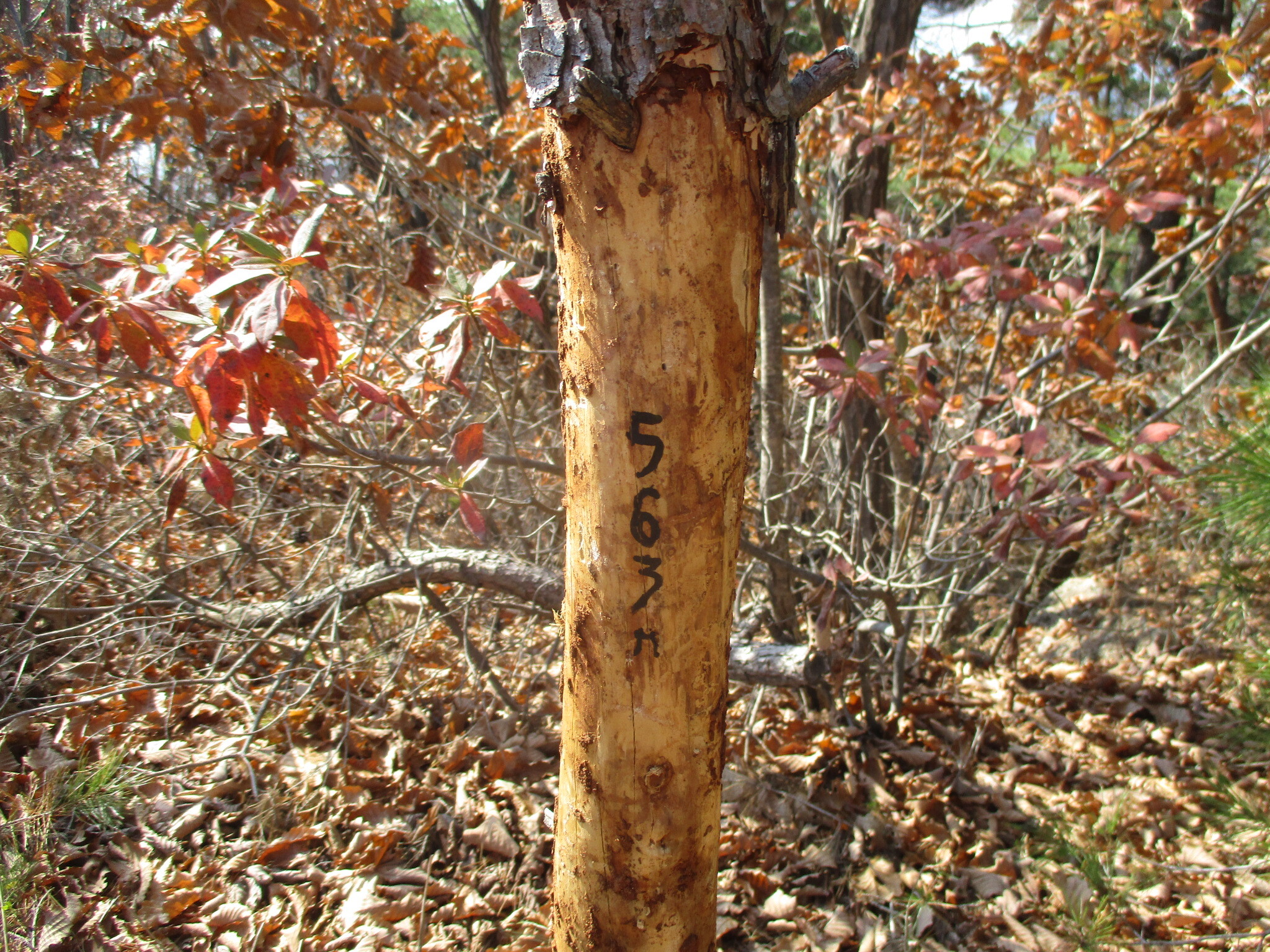 갈림길 지나 50여m 위에 있는 돼지코를 찍고 옴~돼지코(334m, 부러진 큰나무)~갈림길로 빽~흐릿한 밭길로