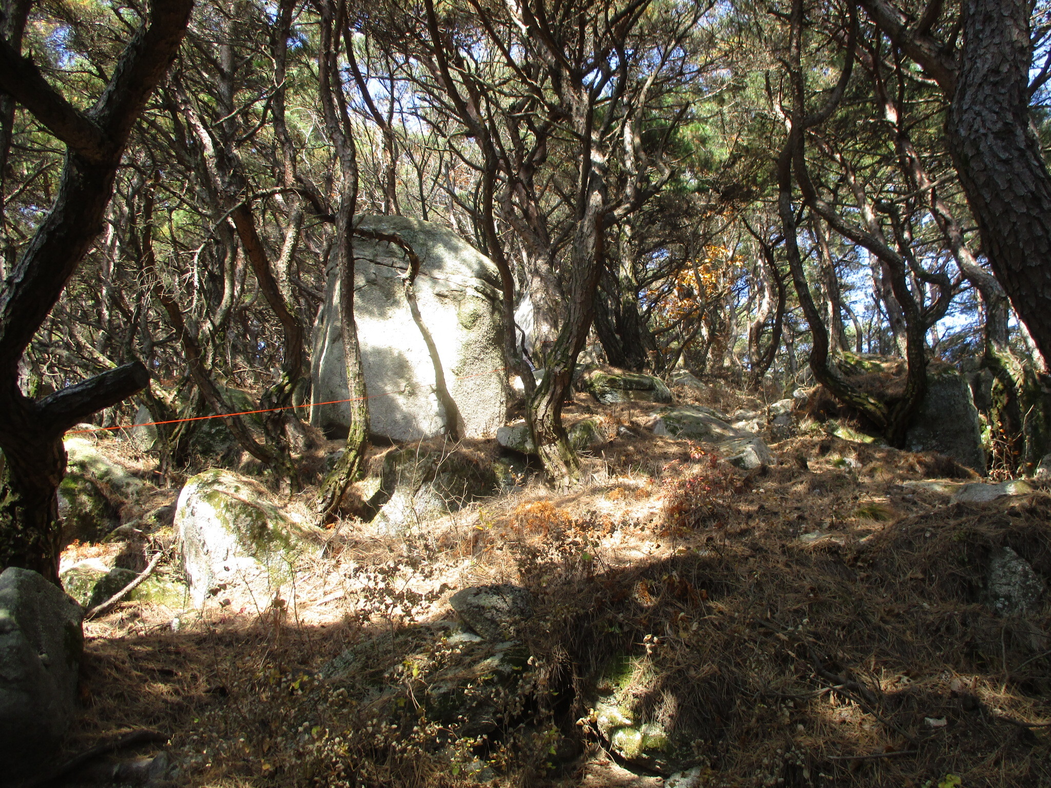 그 뒤로도 만나는 봉우리 갈림길마다 왼쪽 사면으로 우회하면 크다탄 바우들이 누버있는 바우지대를 지나고 k2 대간팀인