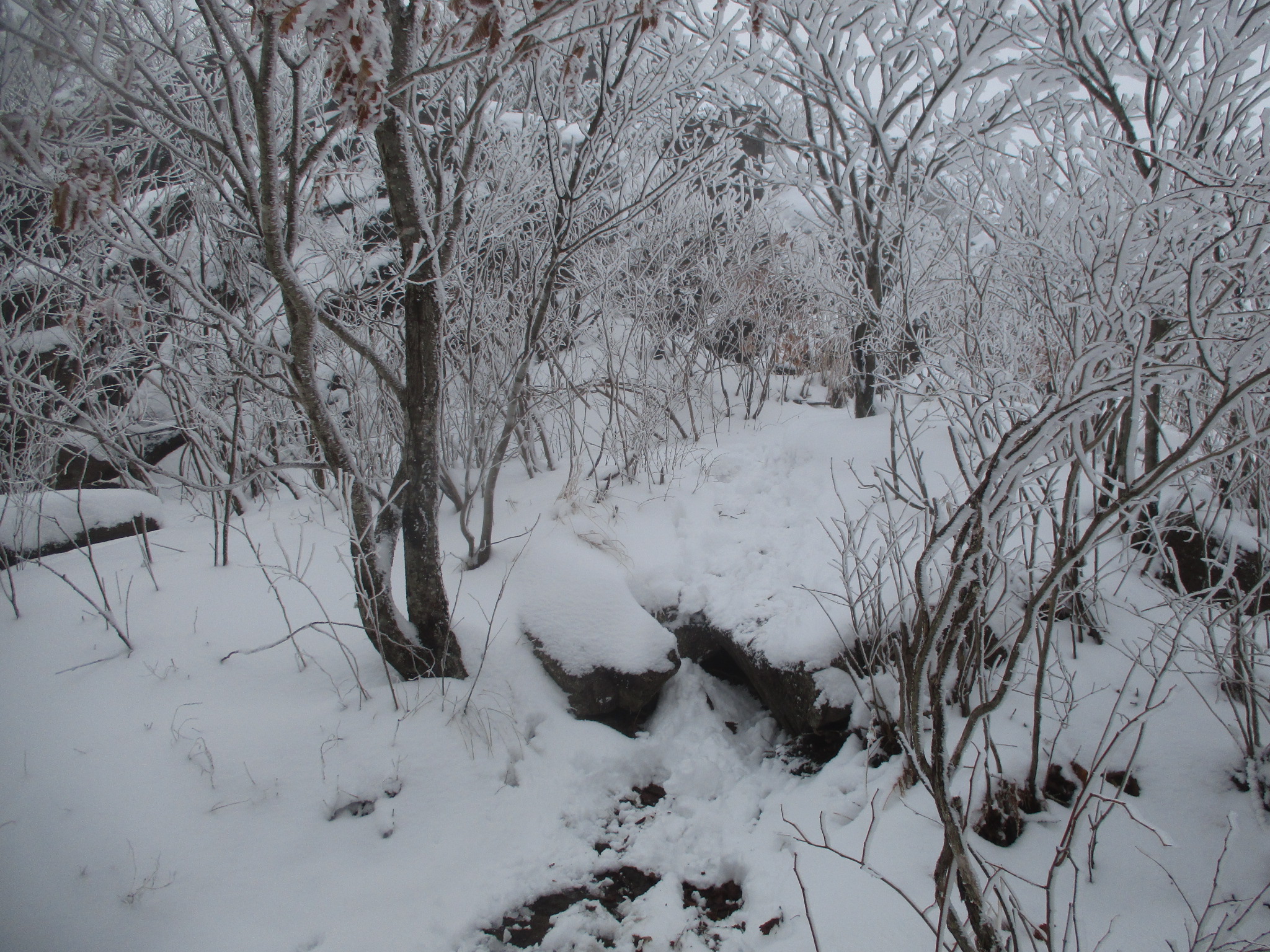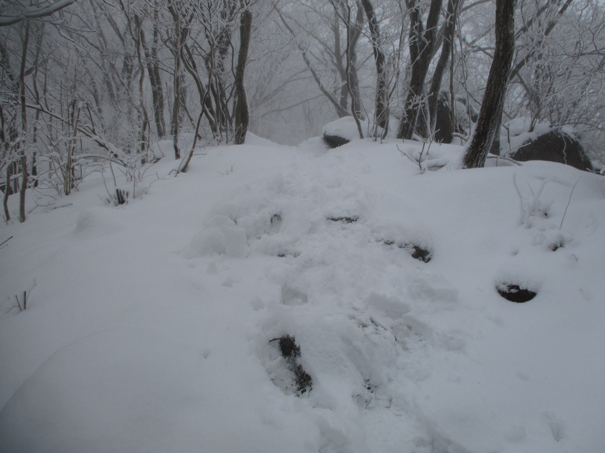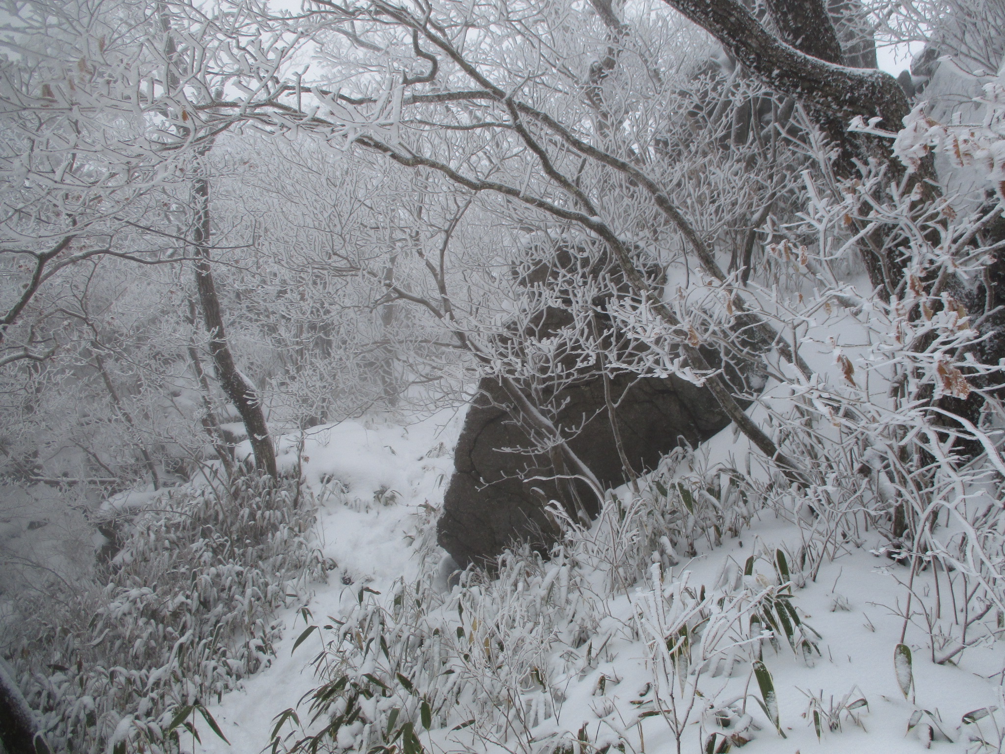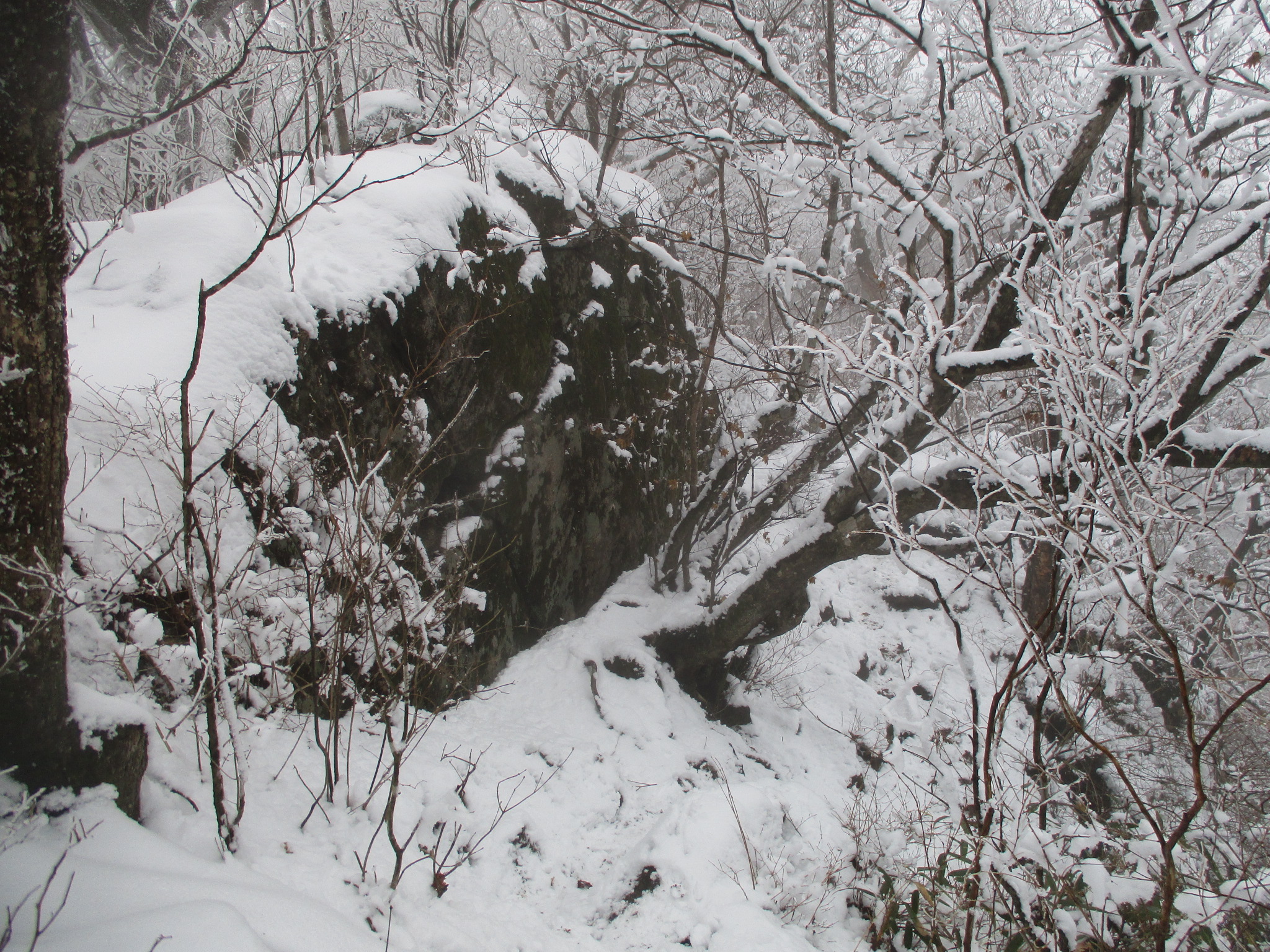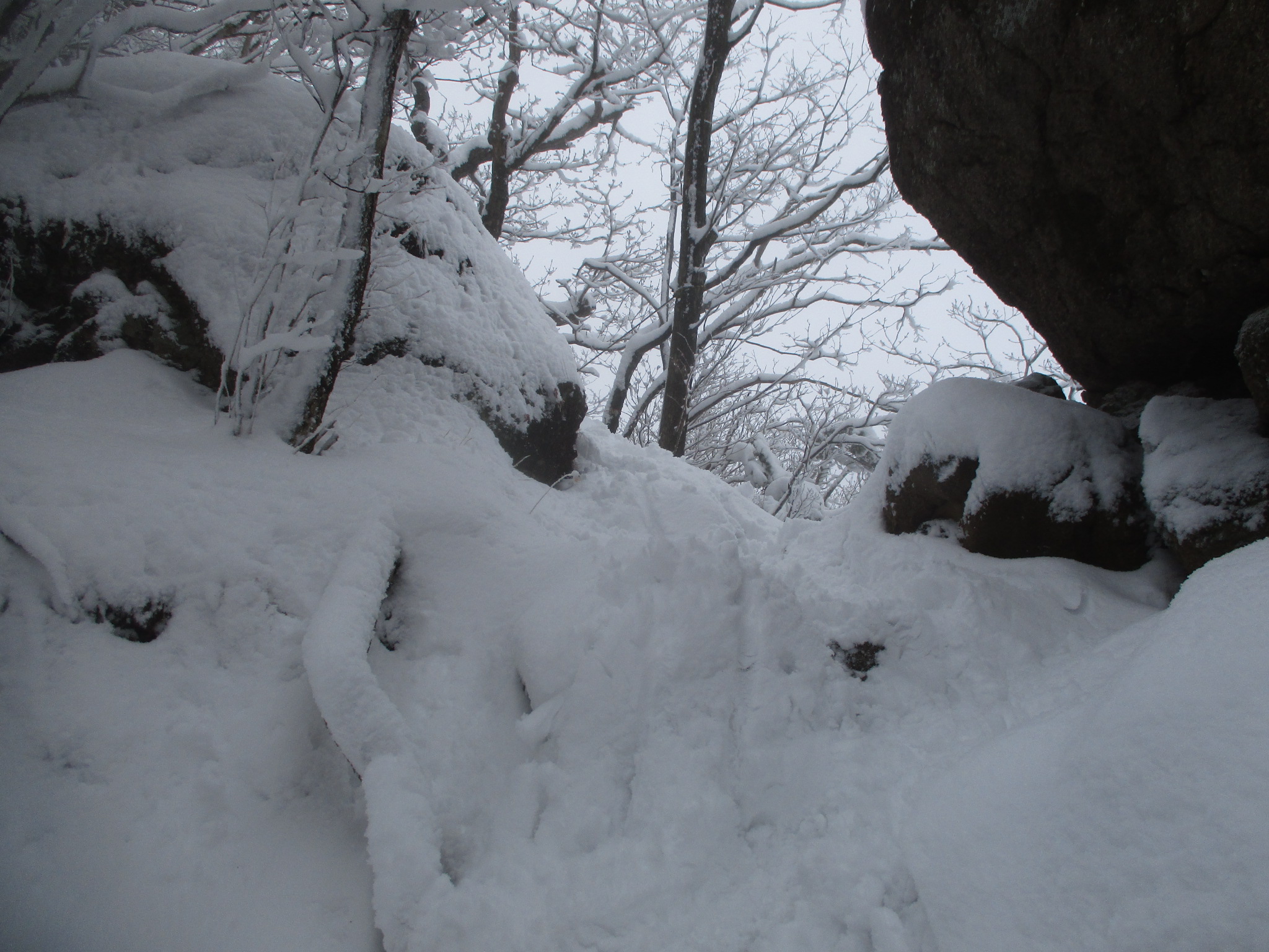 무릎까지 빠지는 심설지대 지나~산죽밭 지나 바위 오름길~고도 1,353m 표시 구조목~큰 바위 오른쪽으로 우회~