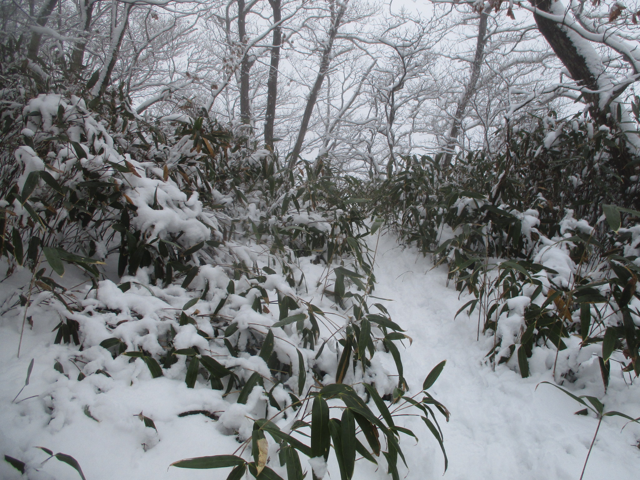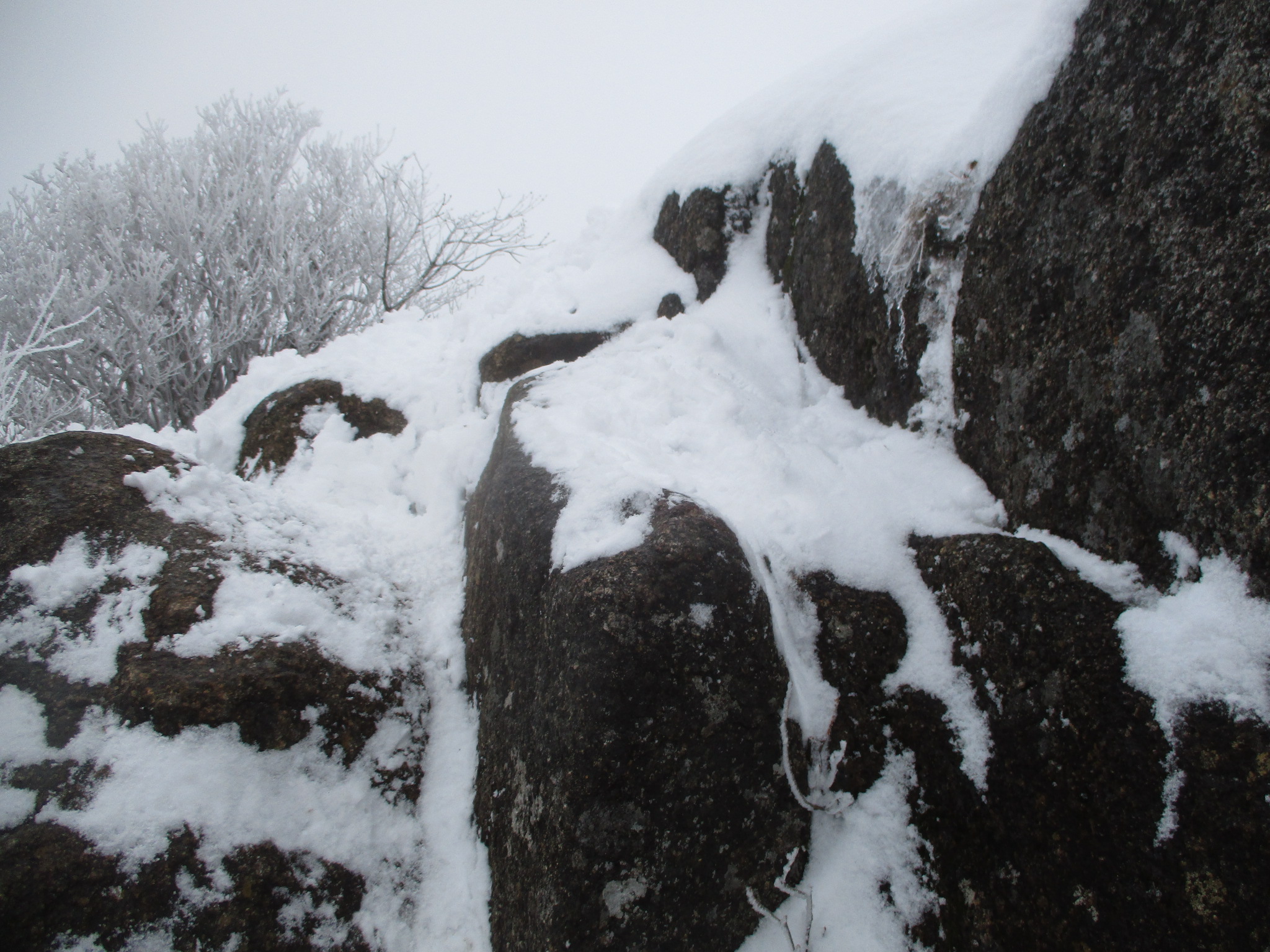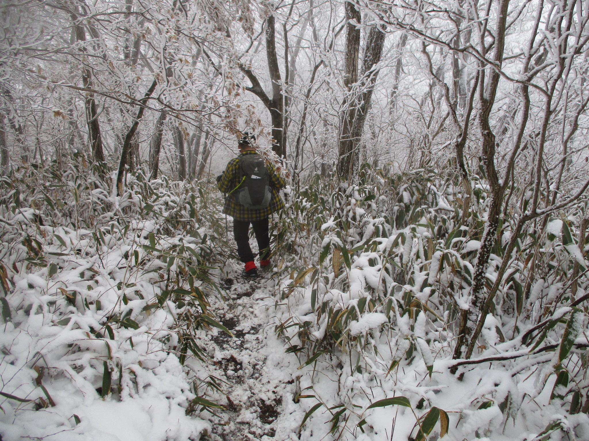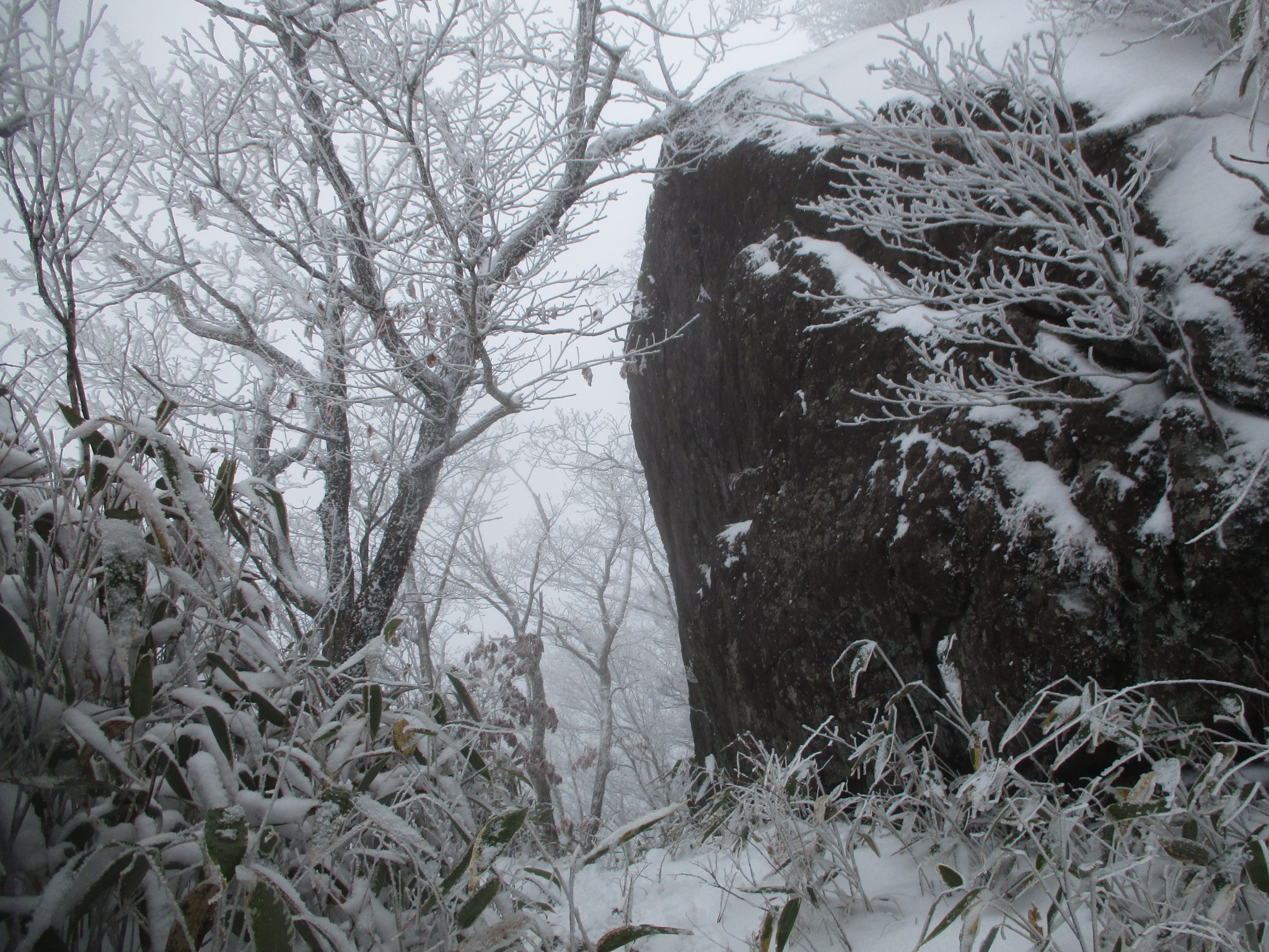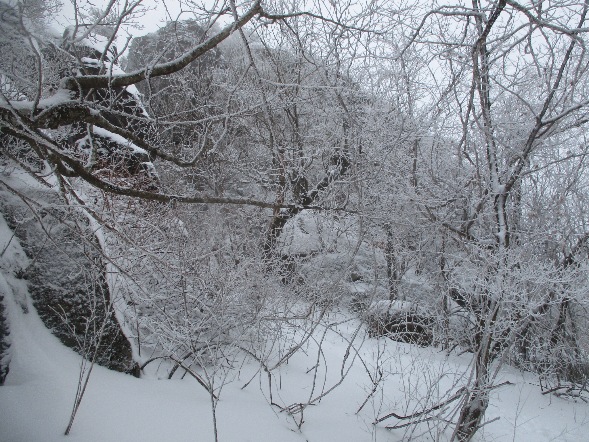 무릎까지 빠지는 심설지대 지나~산죽밭 지나 바위 오름길~고도 1,353m 표시 구조목~큰 바위 오른쪽으로 우회~