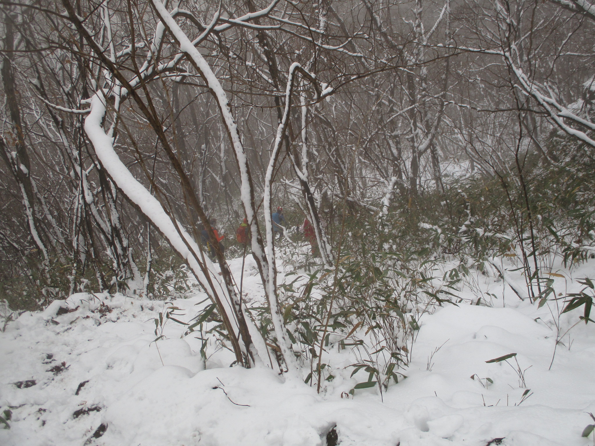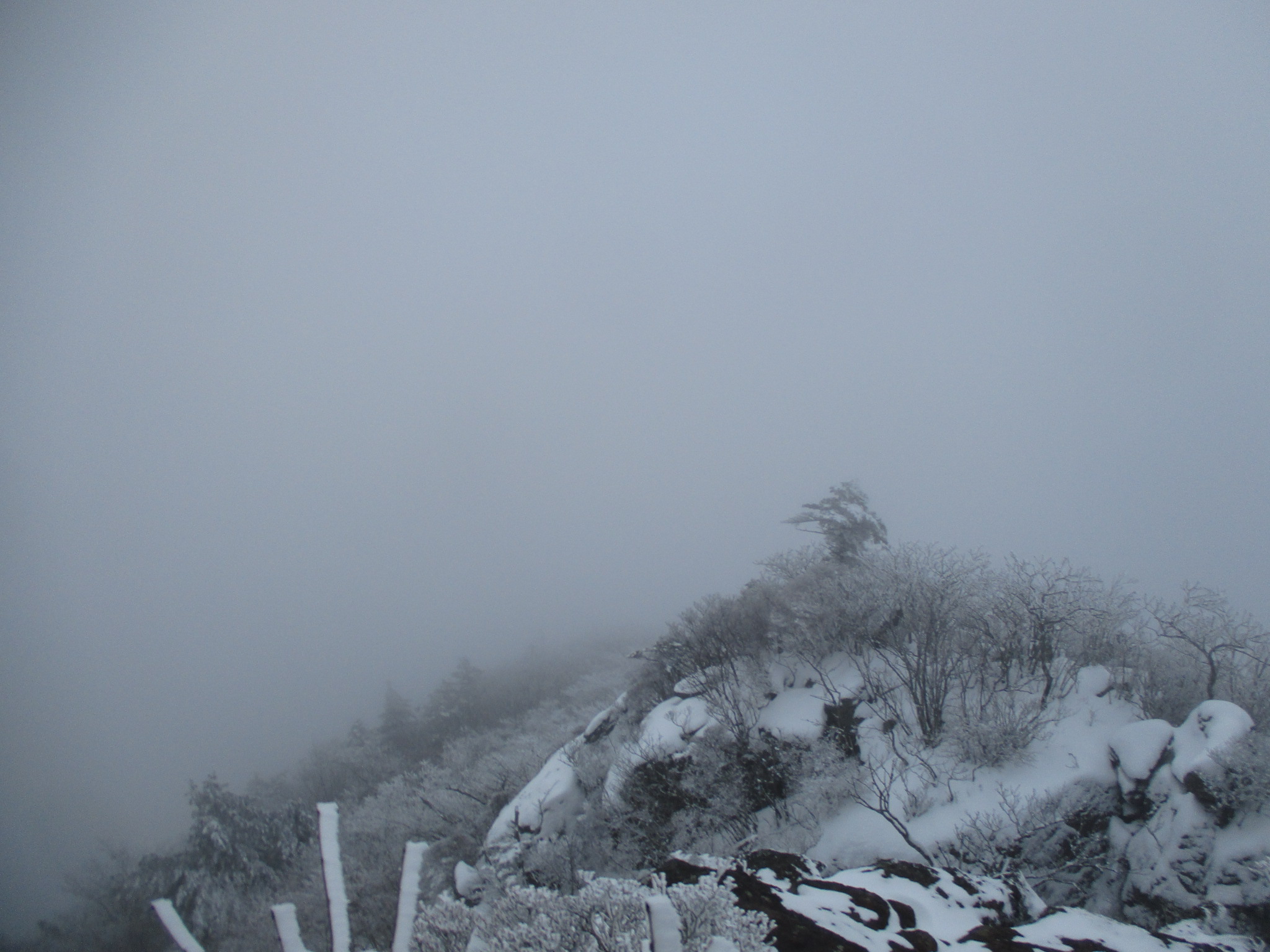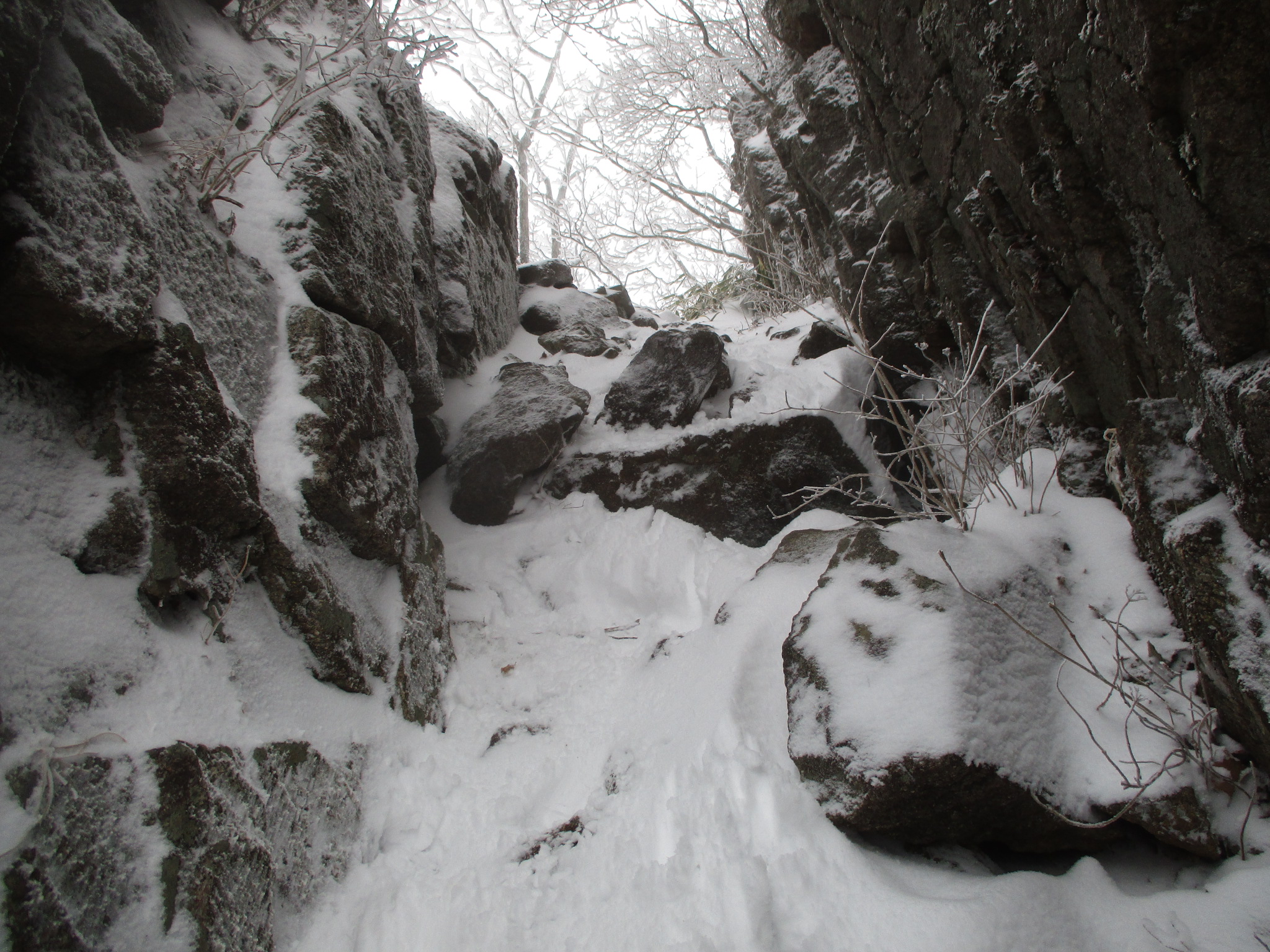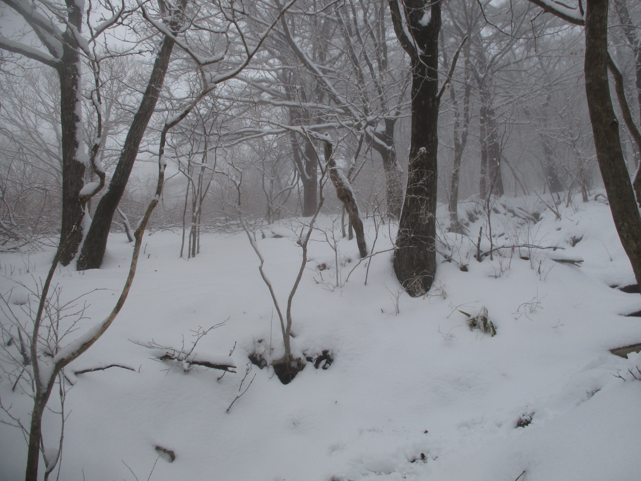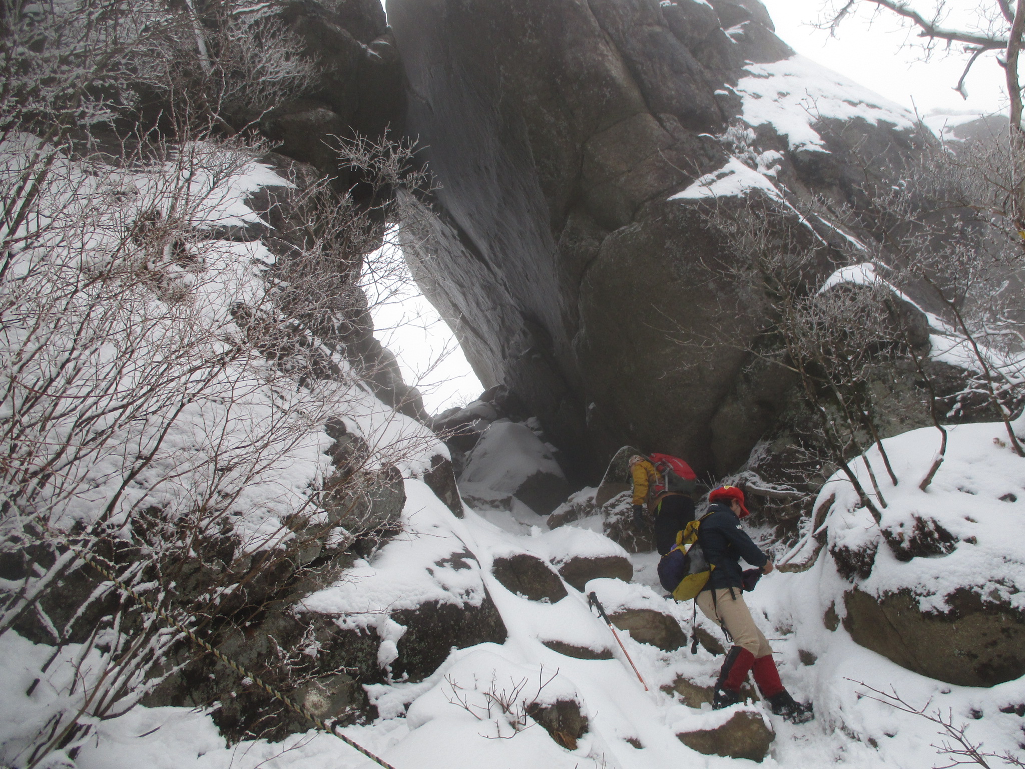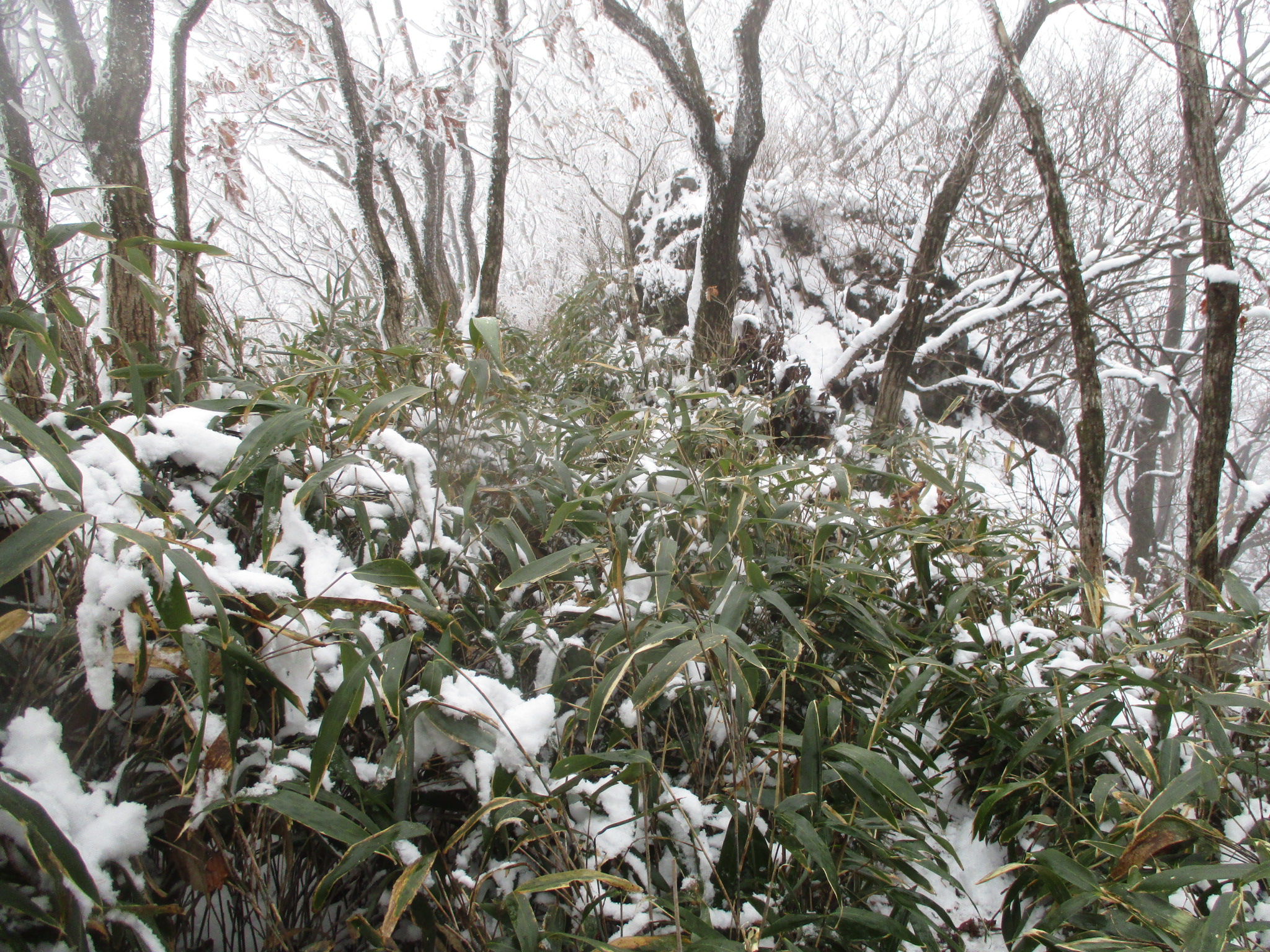 무릎까지 빠지는 심설지대 지나~산죽밭 지나 바위 오름길~고도 1,353m 표시 구조목~큰 바위 오른쪽으로 우회~