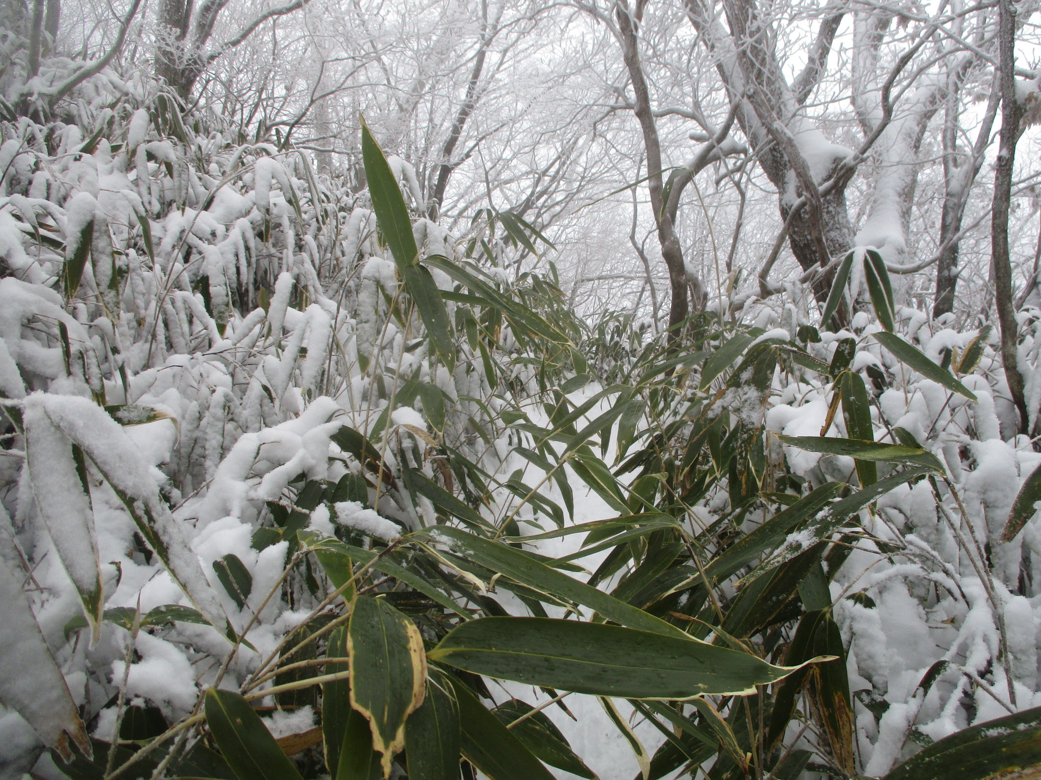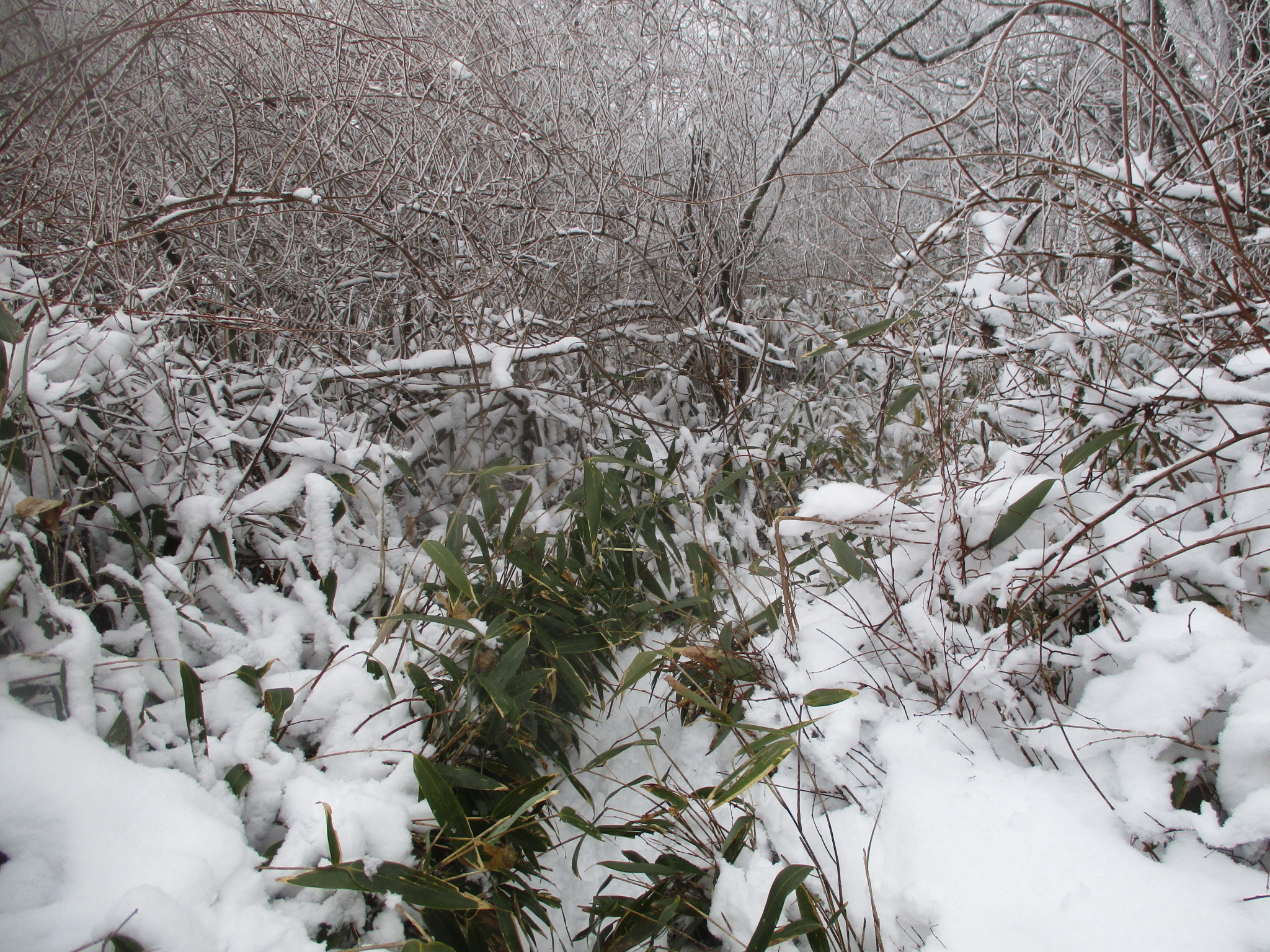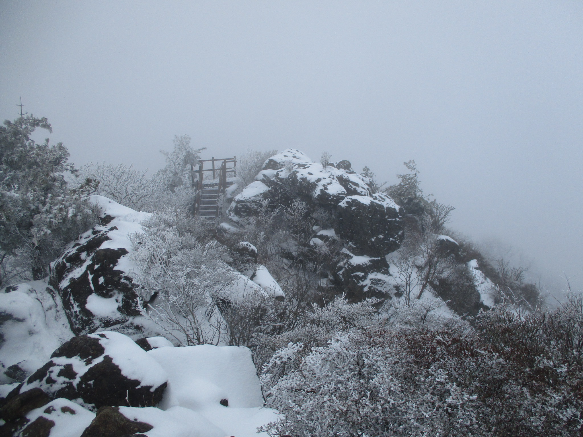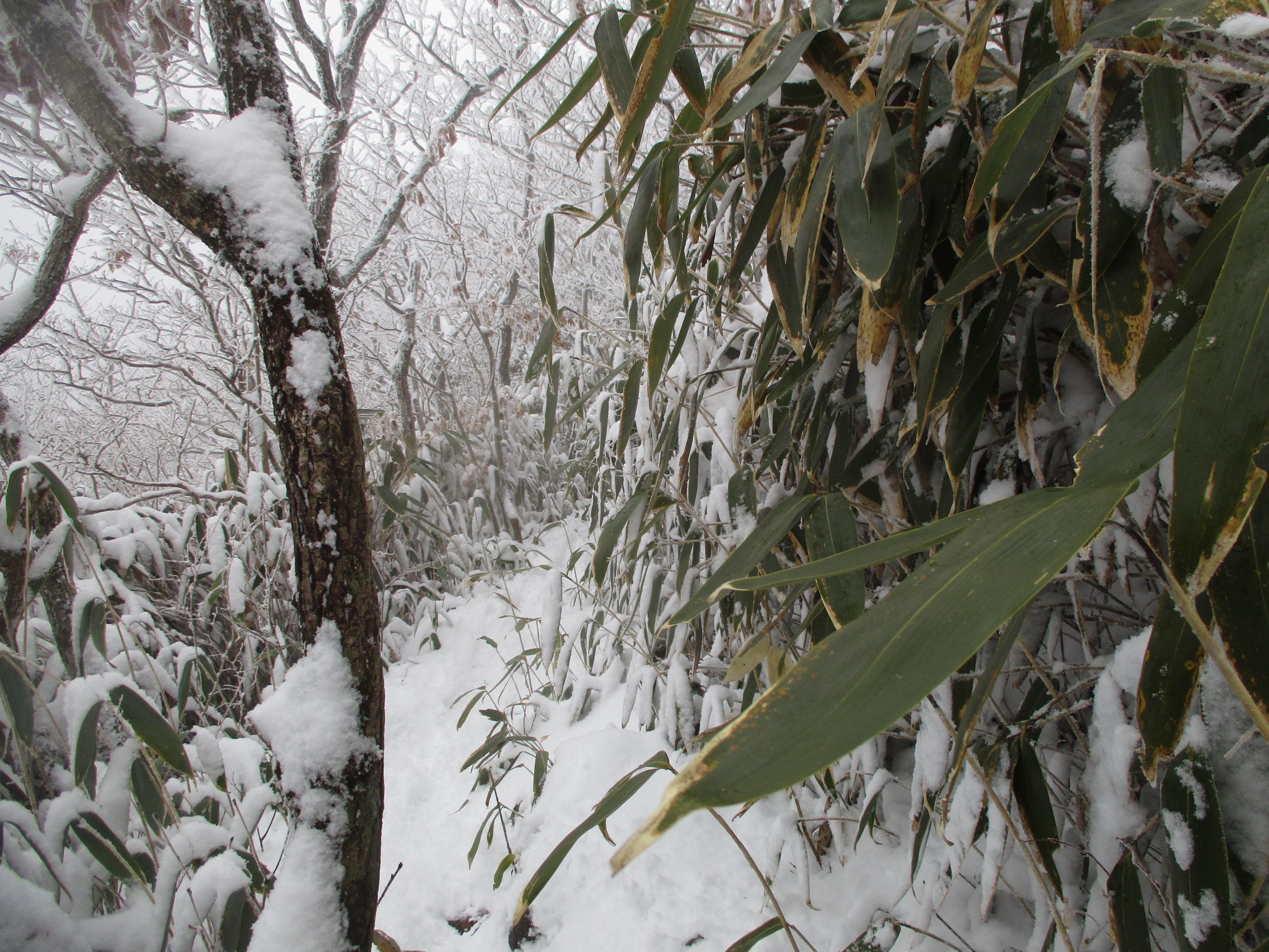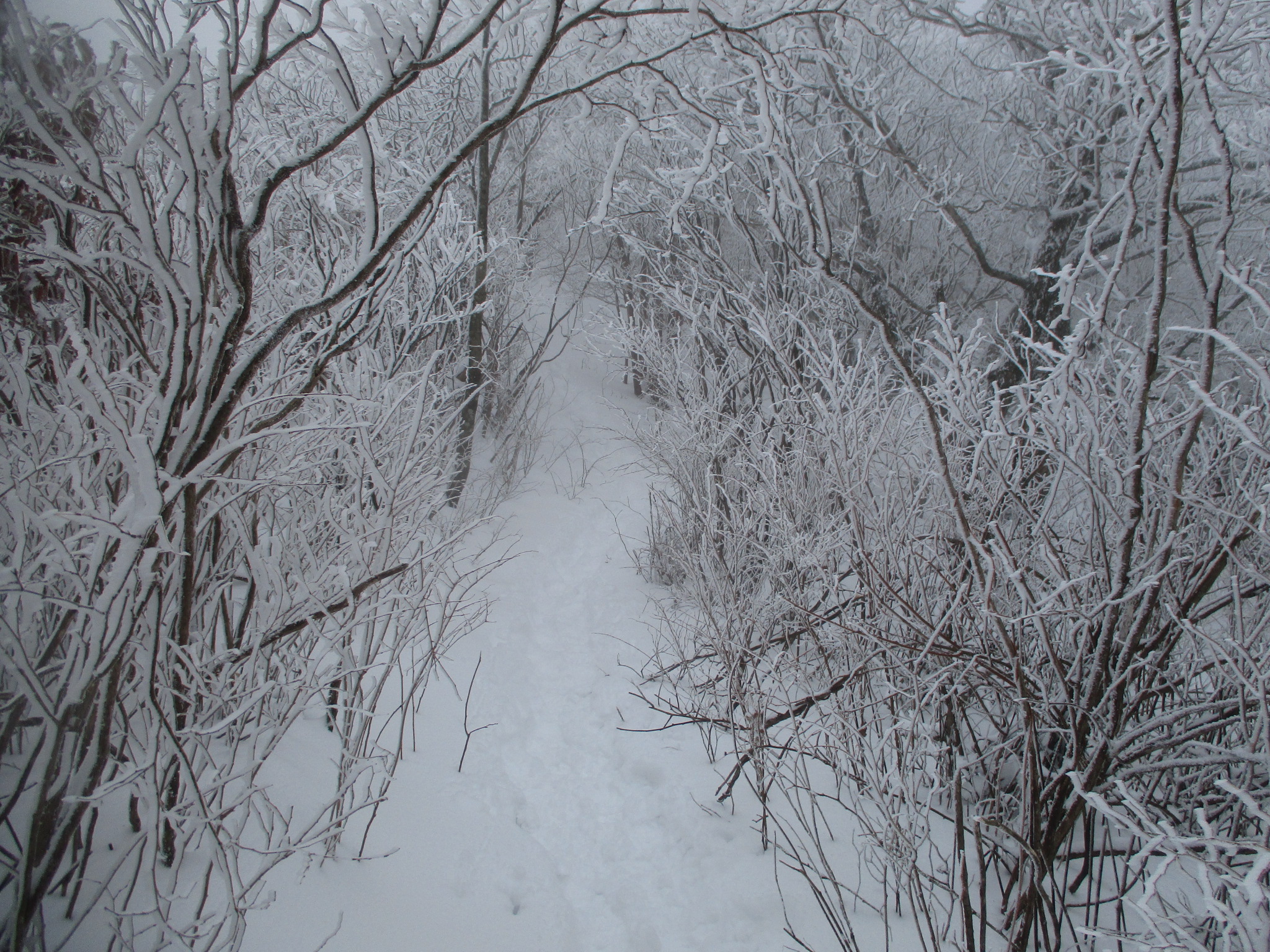 무릎까지 빠지는 심설지대 지나~산죽밭 지나 바위 오름길~고도 1,353m 표시 구조목~큰 바위 오른쪽으로 우회~