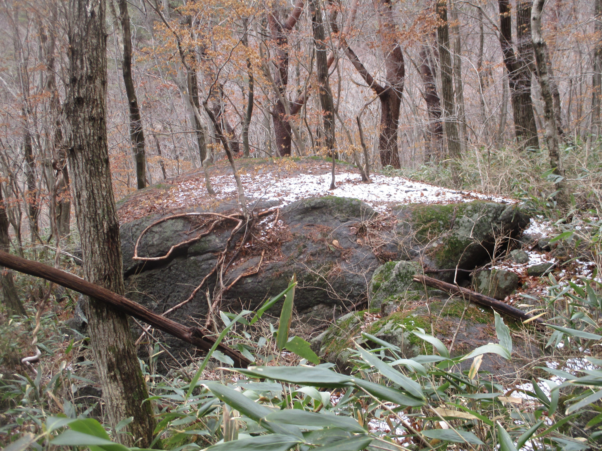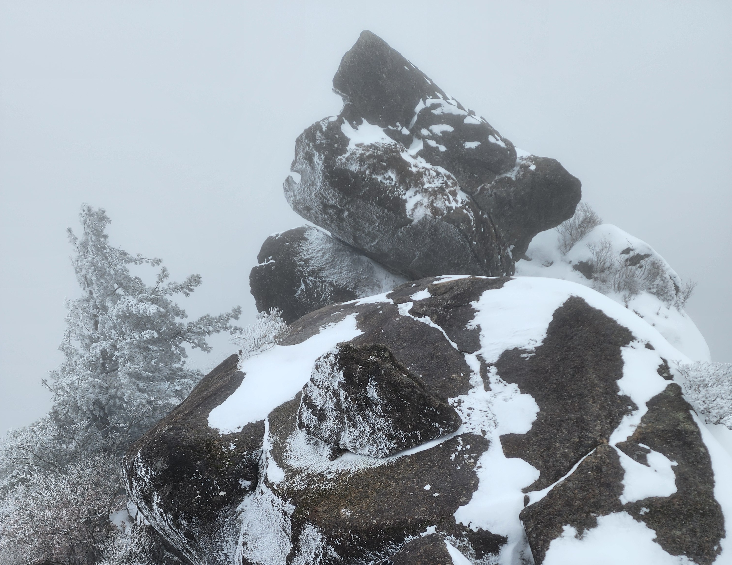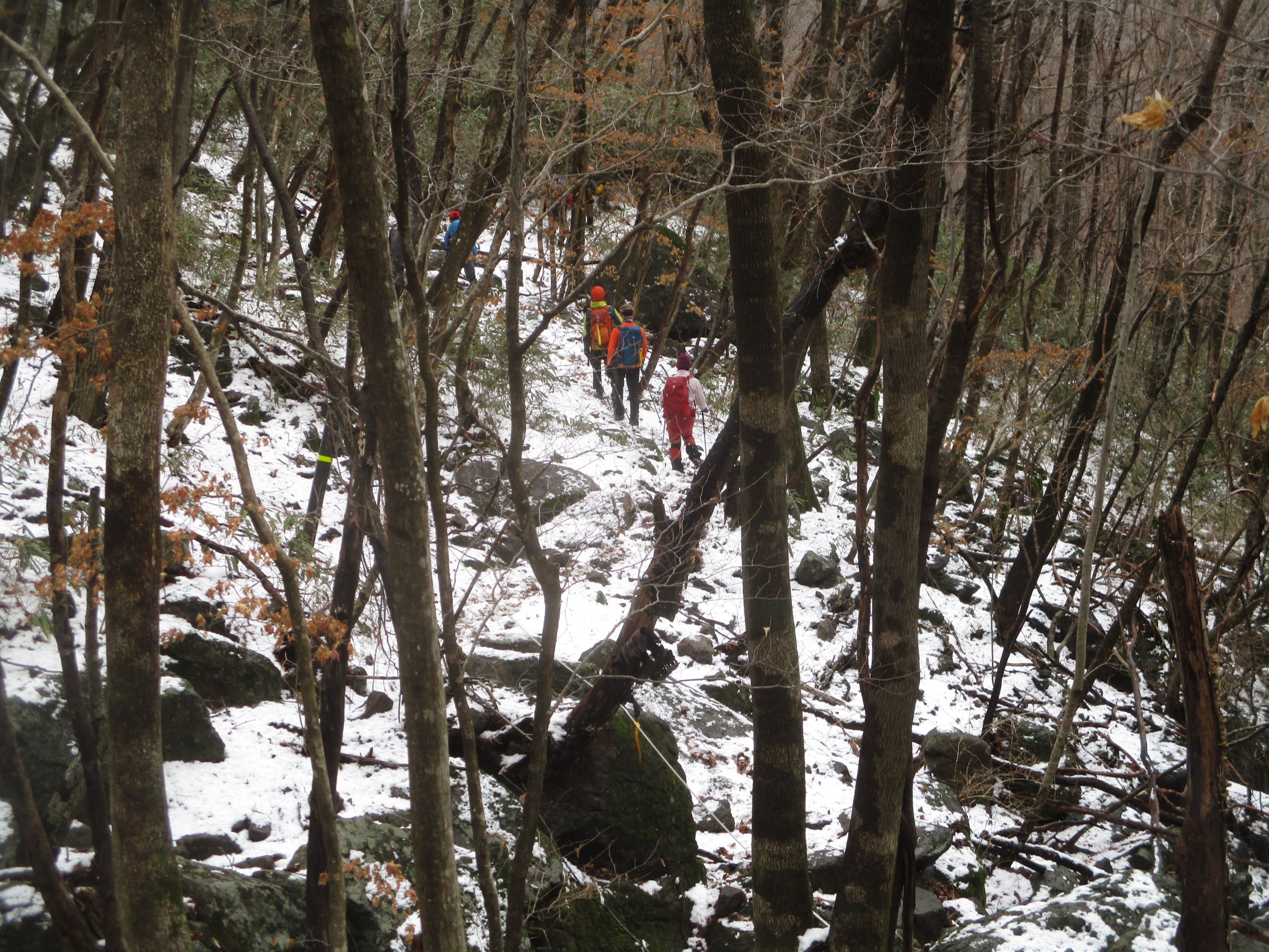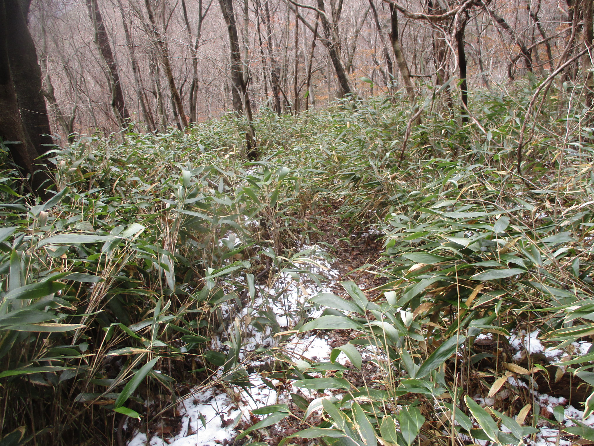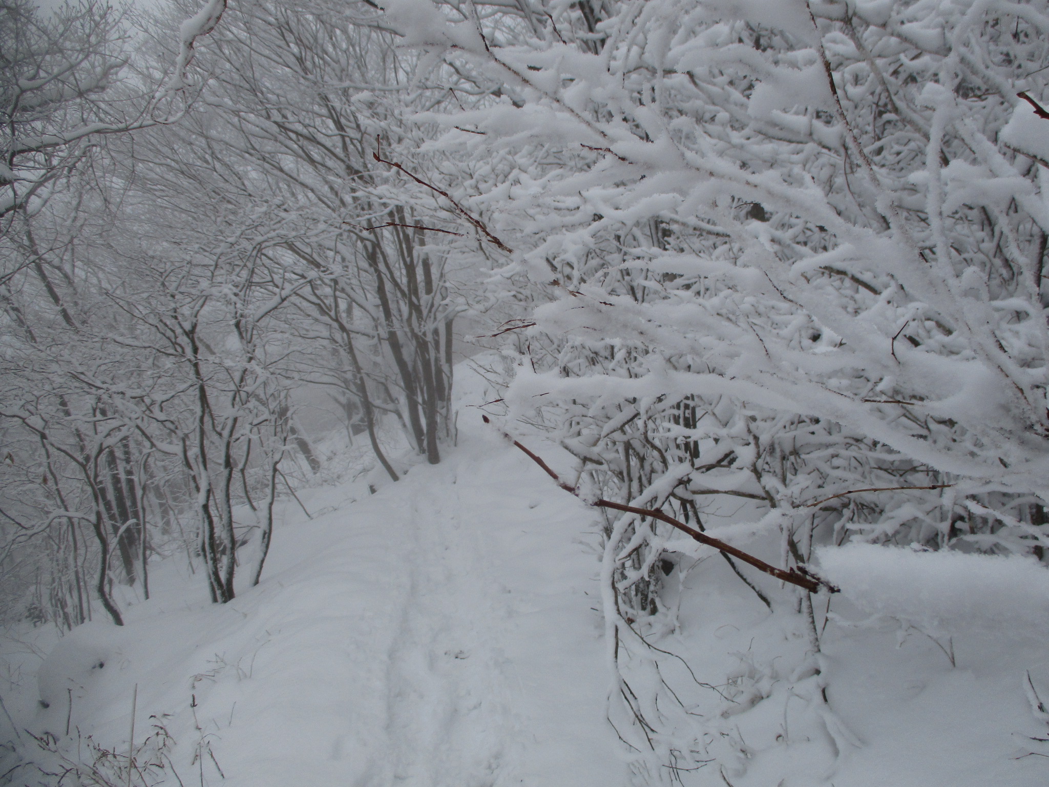무릎까지 빠지는 심설지대 지나~산죽밭 지나 바위 오름길~고도 1,353m 표시 구조목~큰 바위 오른쪽으로 우회~