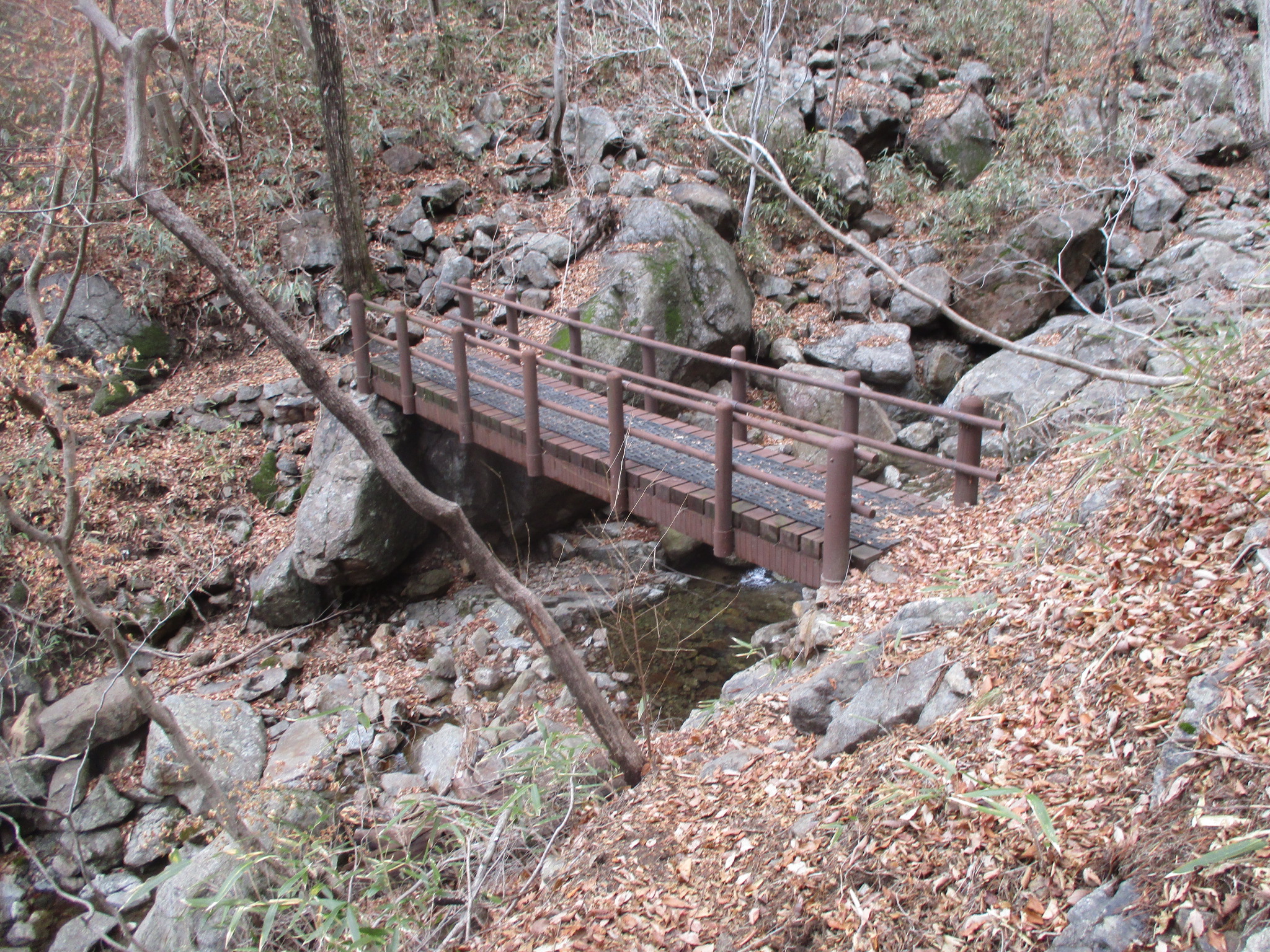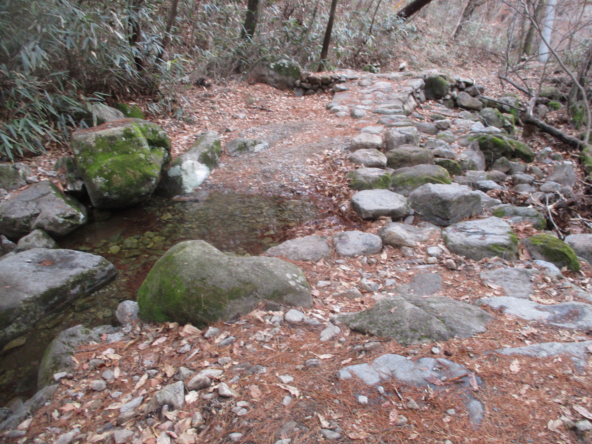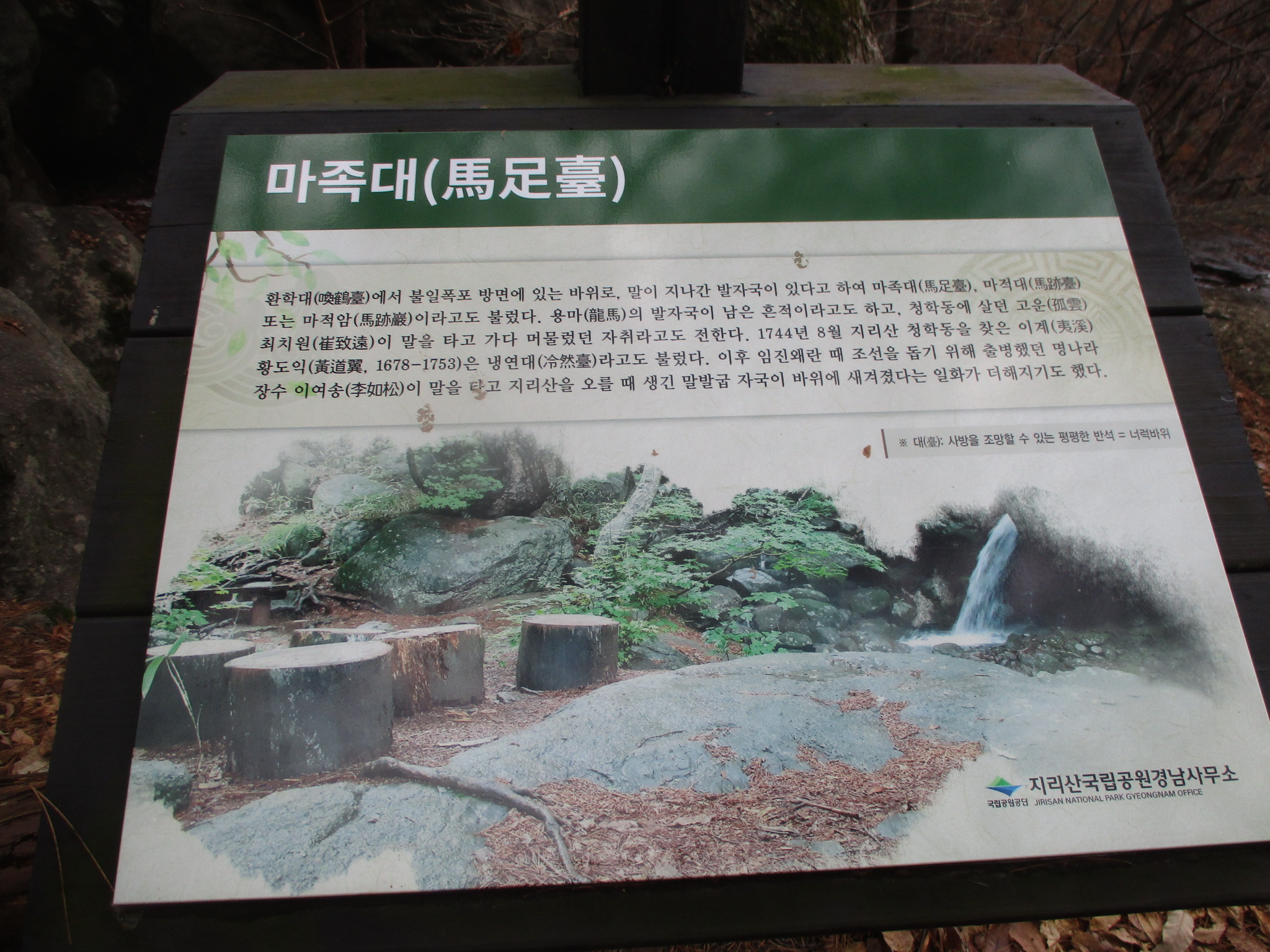 마족대(馬足臺) 안내판~목교 지나 원숭이바위~이끼낀 너덜 지나~환학대(喚鶴臺)~쌍계사 1.2km 이정표~목교