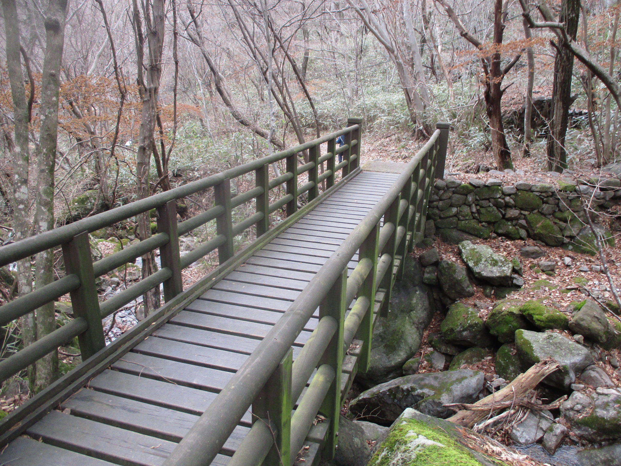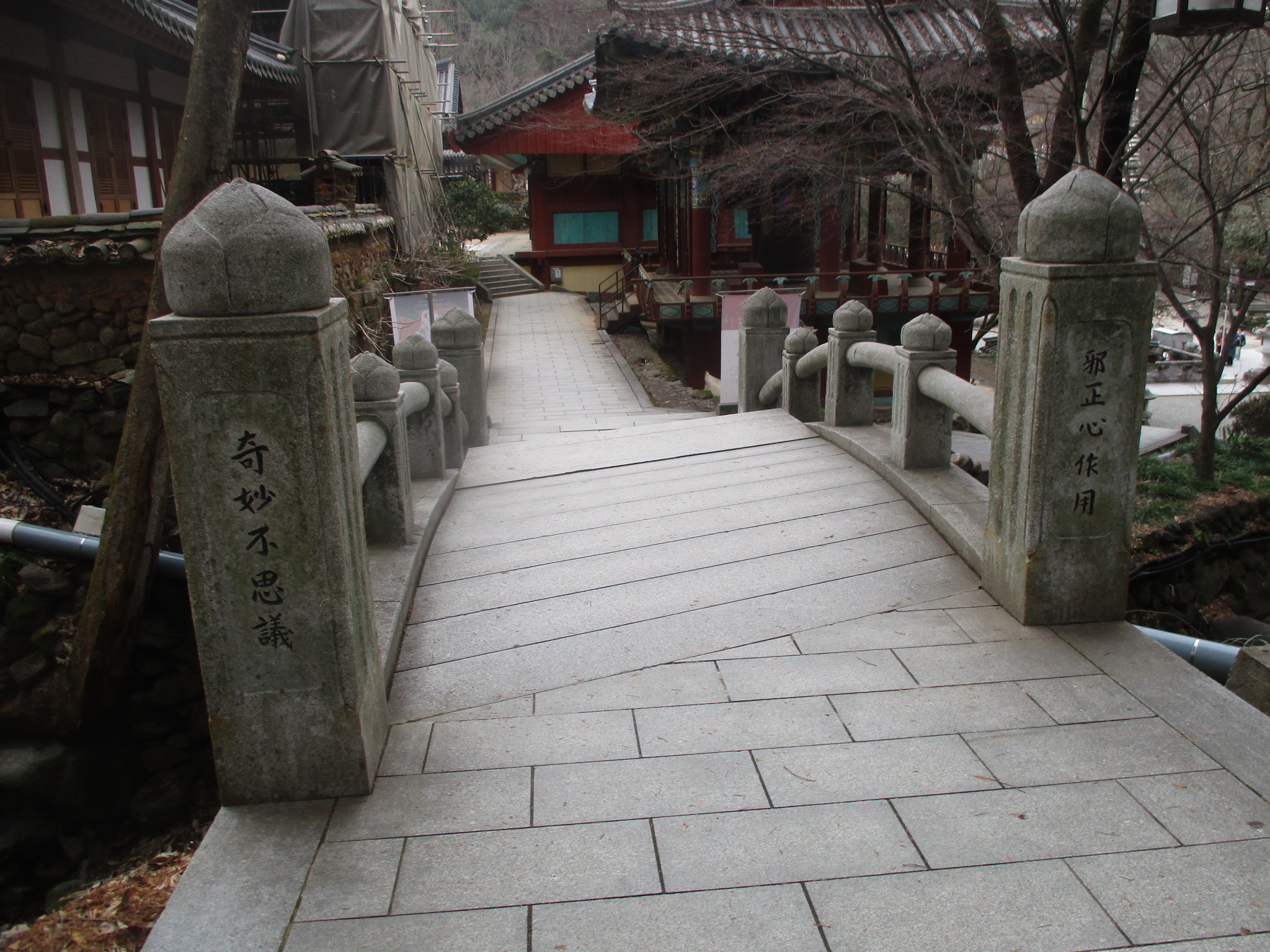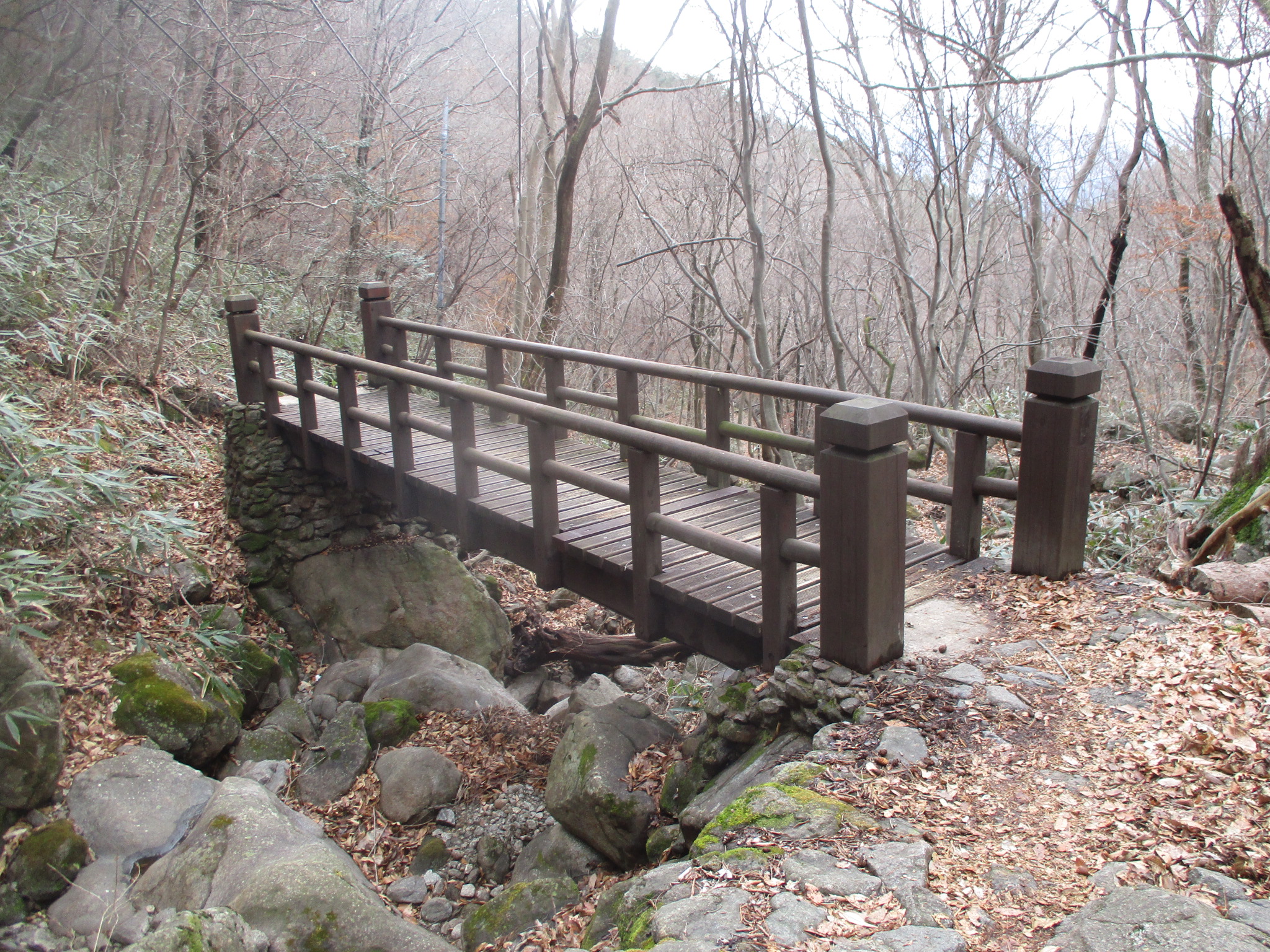마족대(馬足臺) 안내판~목교 지나 원숭이바위~이끼낀 너덜 지나~환학대(喚鶴臺)~쌍계사 1.2km 이정표~목교
