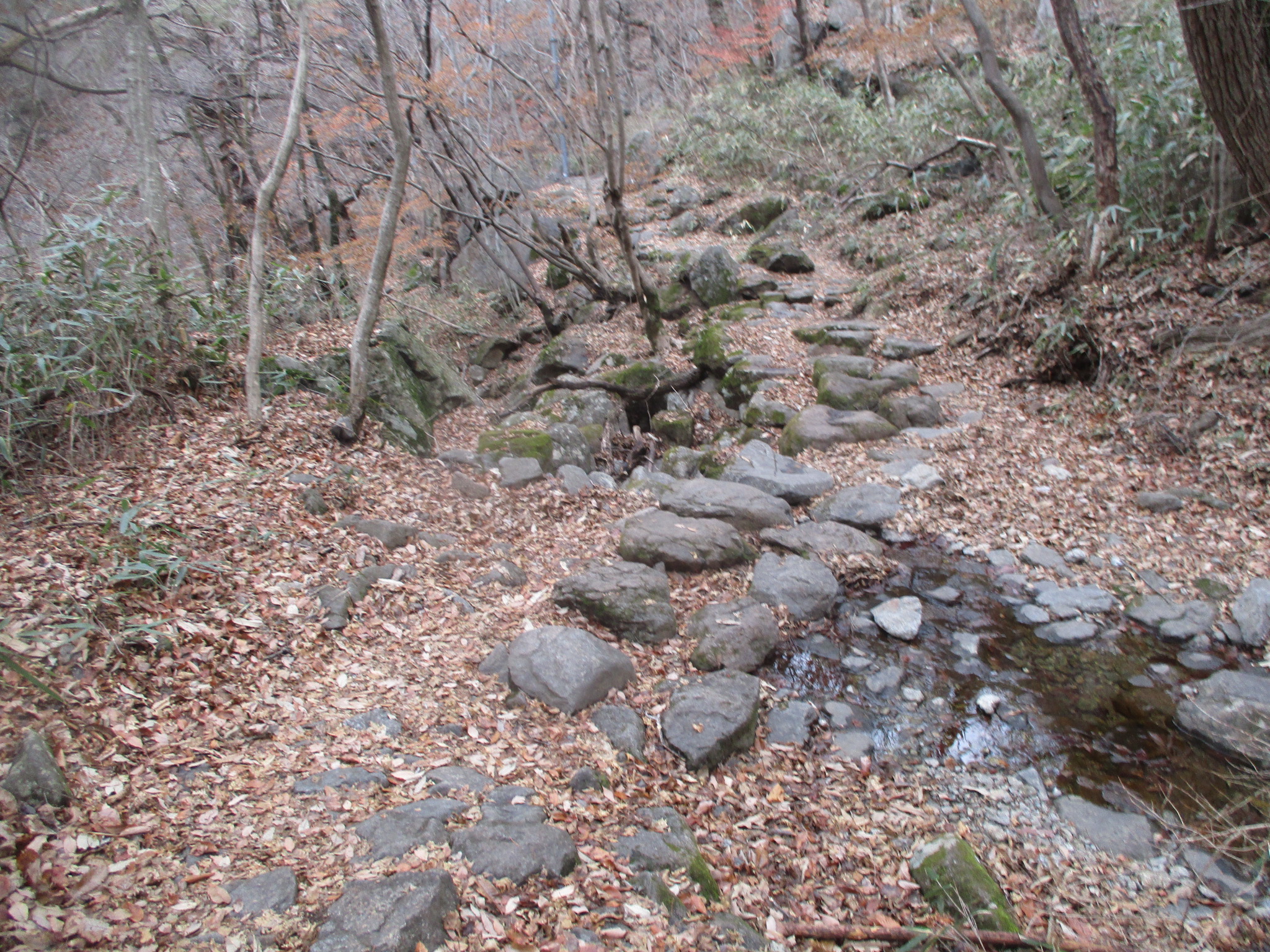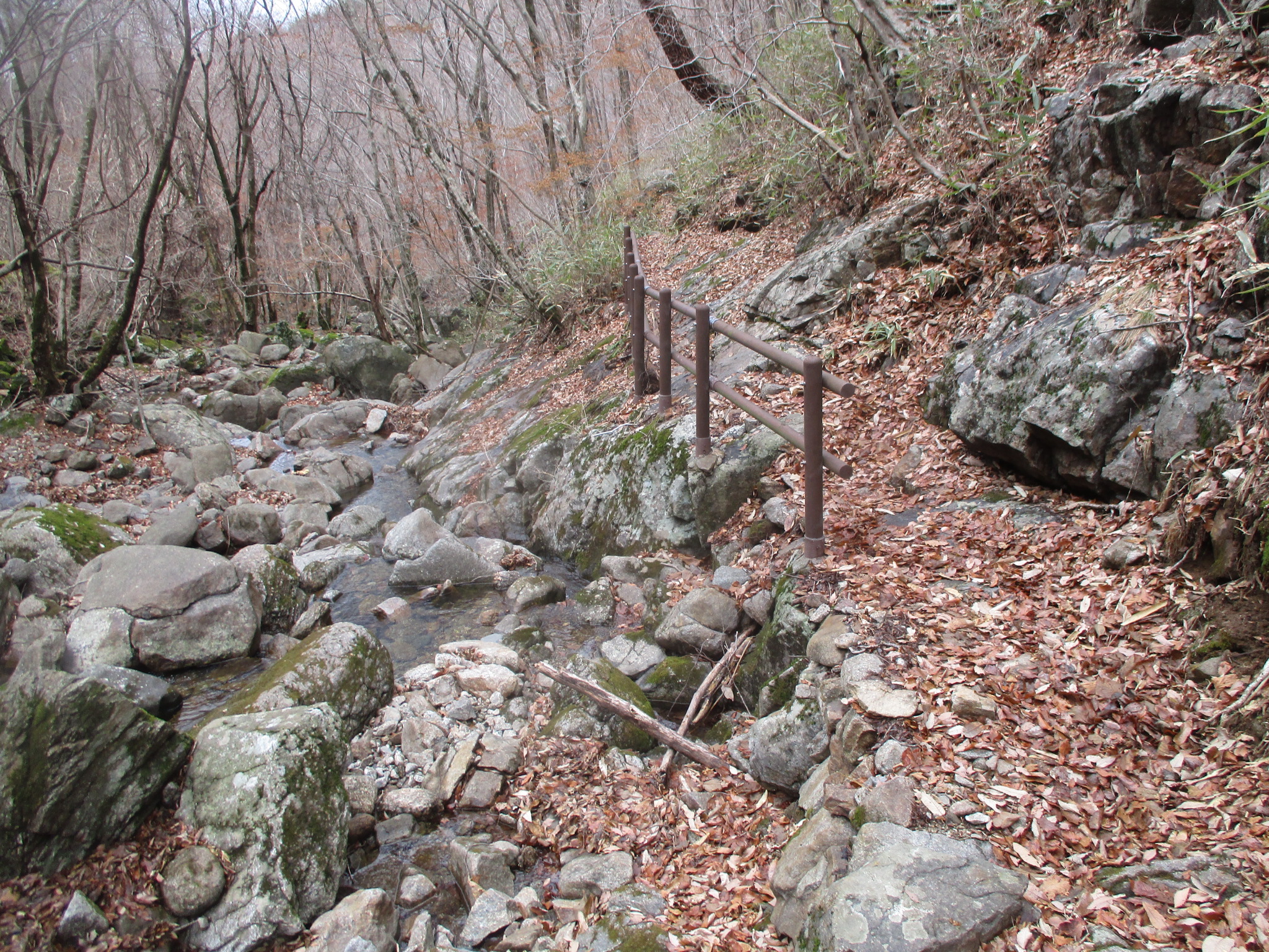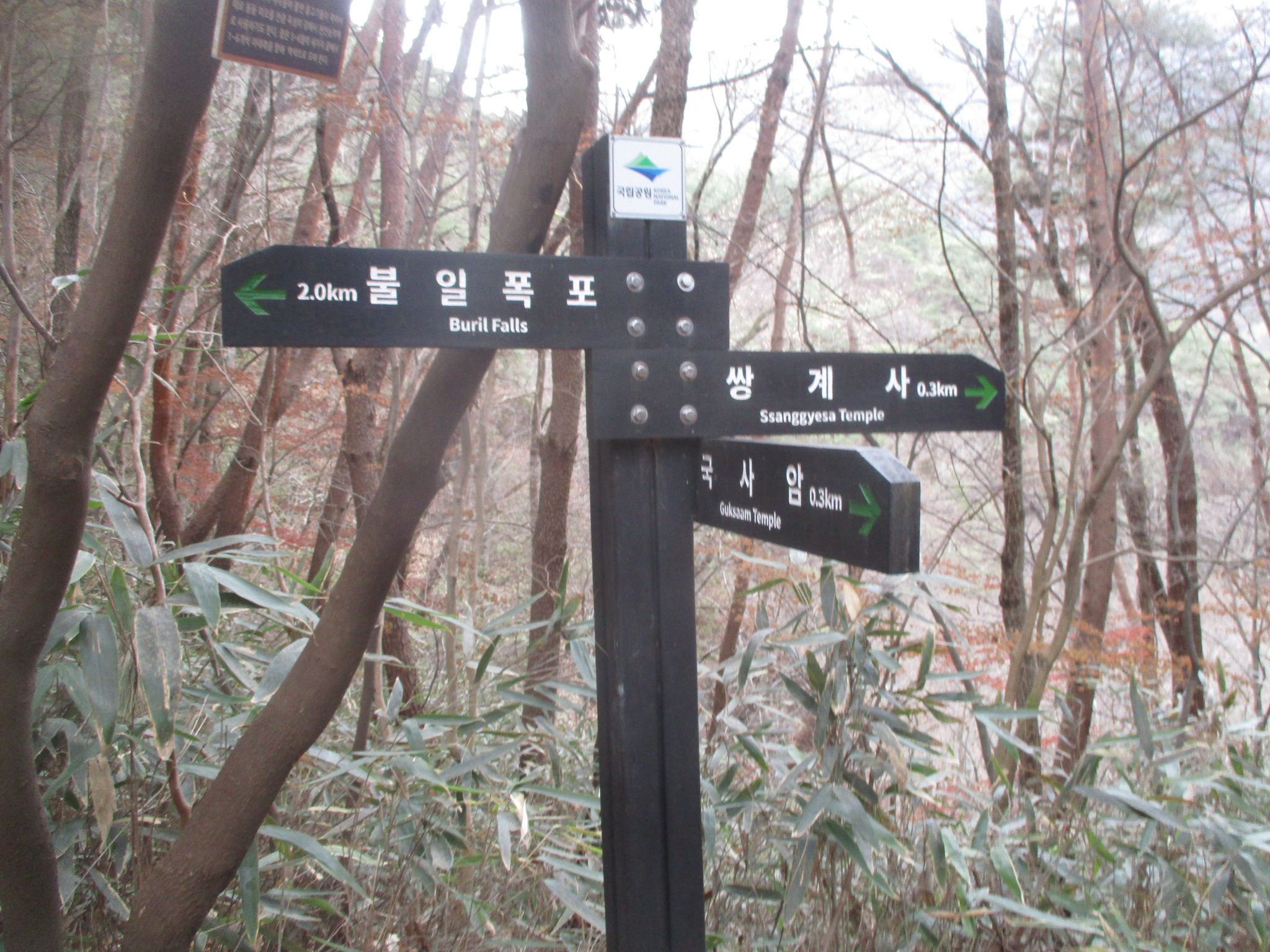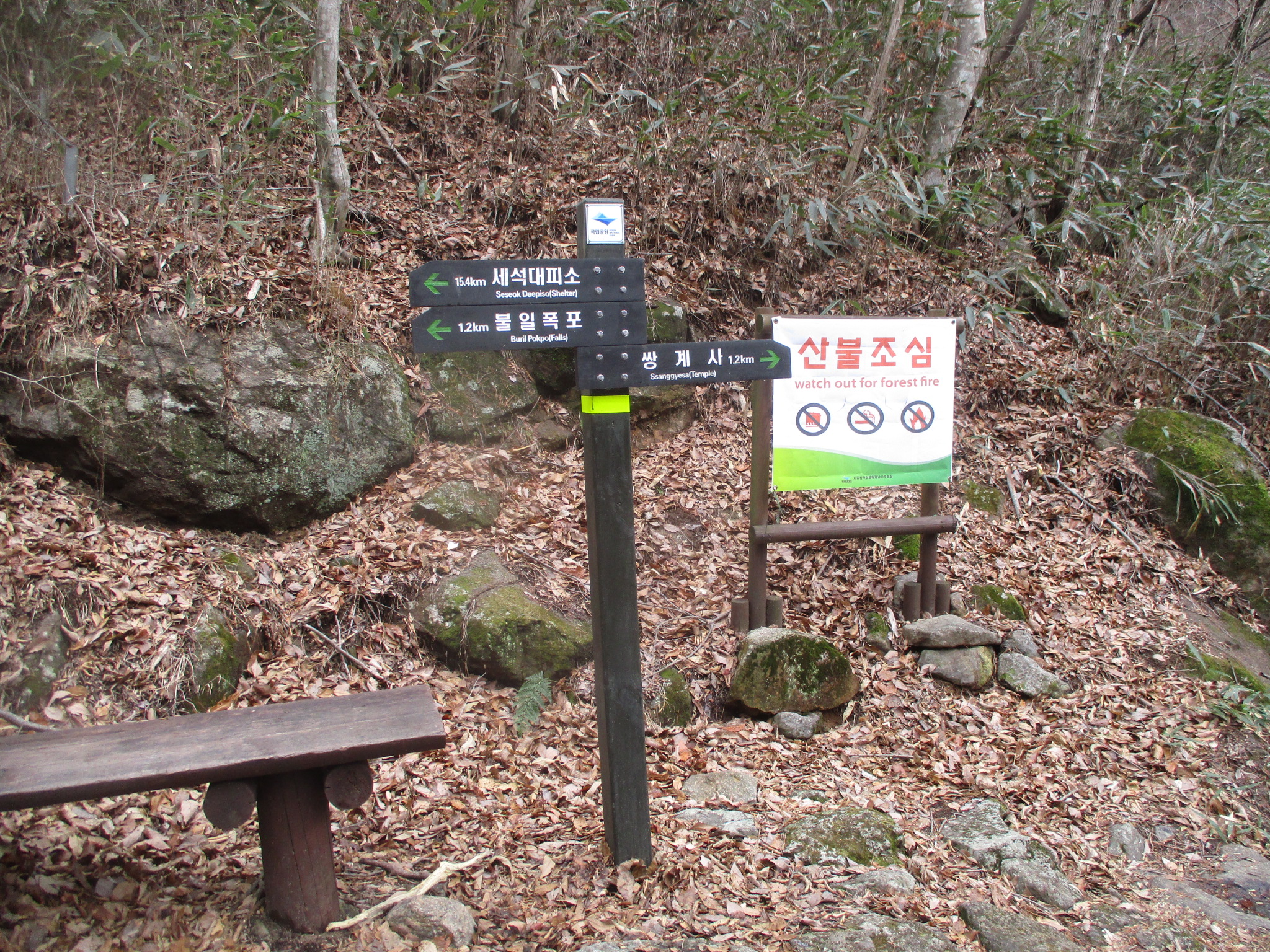 갈림길 이정표~오른쪽 쌍계사 4.9km 방향~가파른 바위계단~산죽밭 지나~무명폭포~목교 연이어 건너~사면길