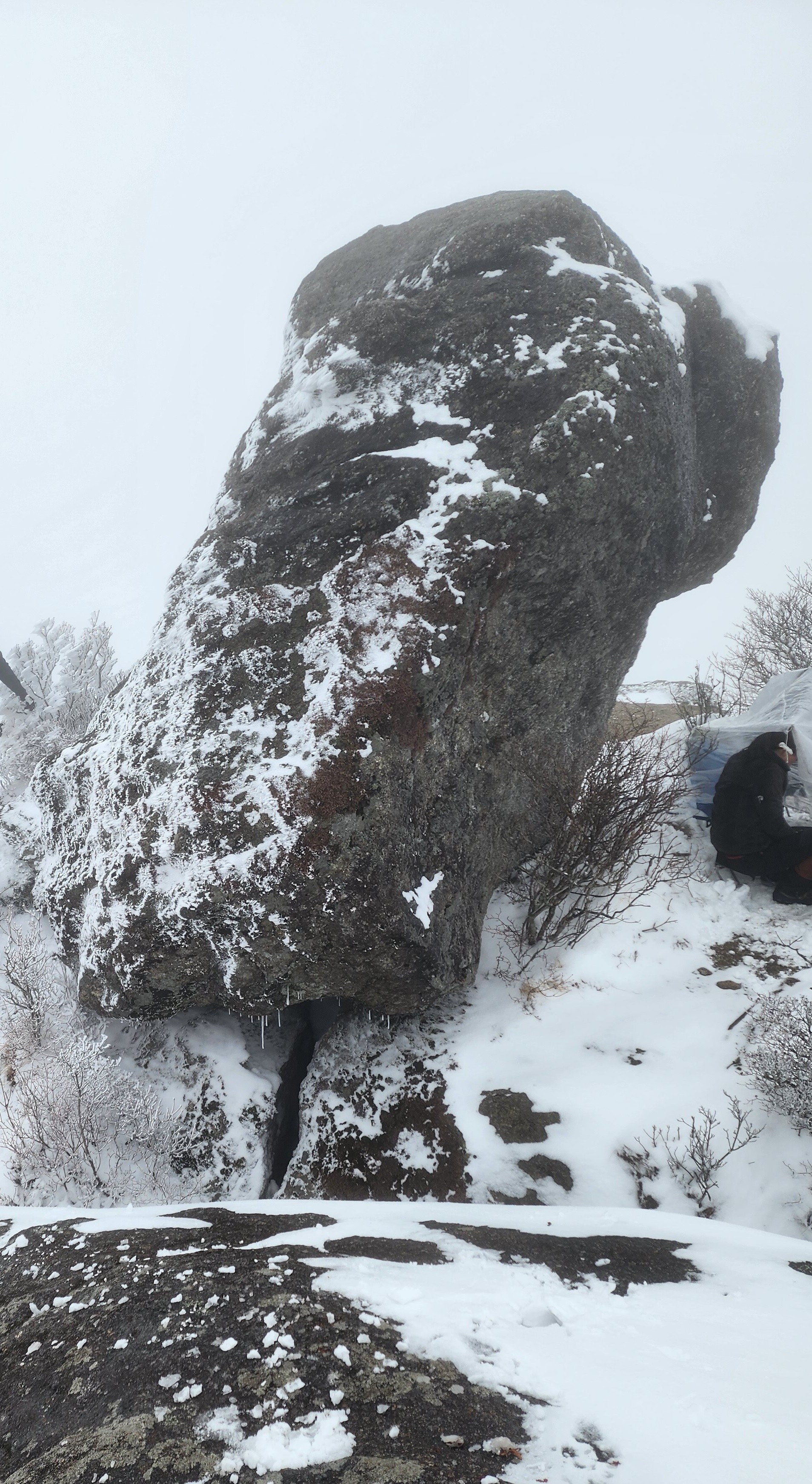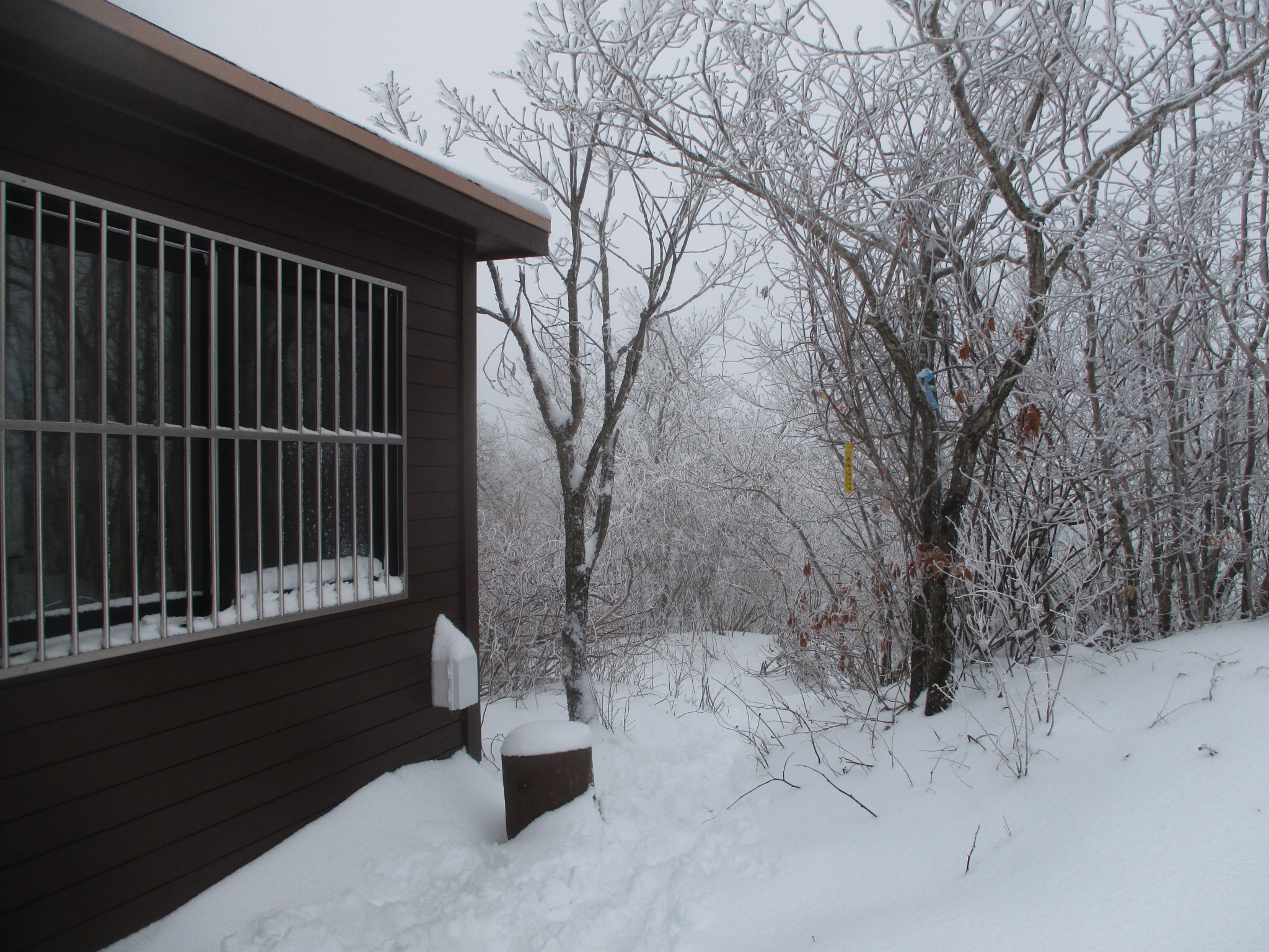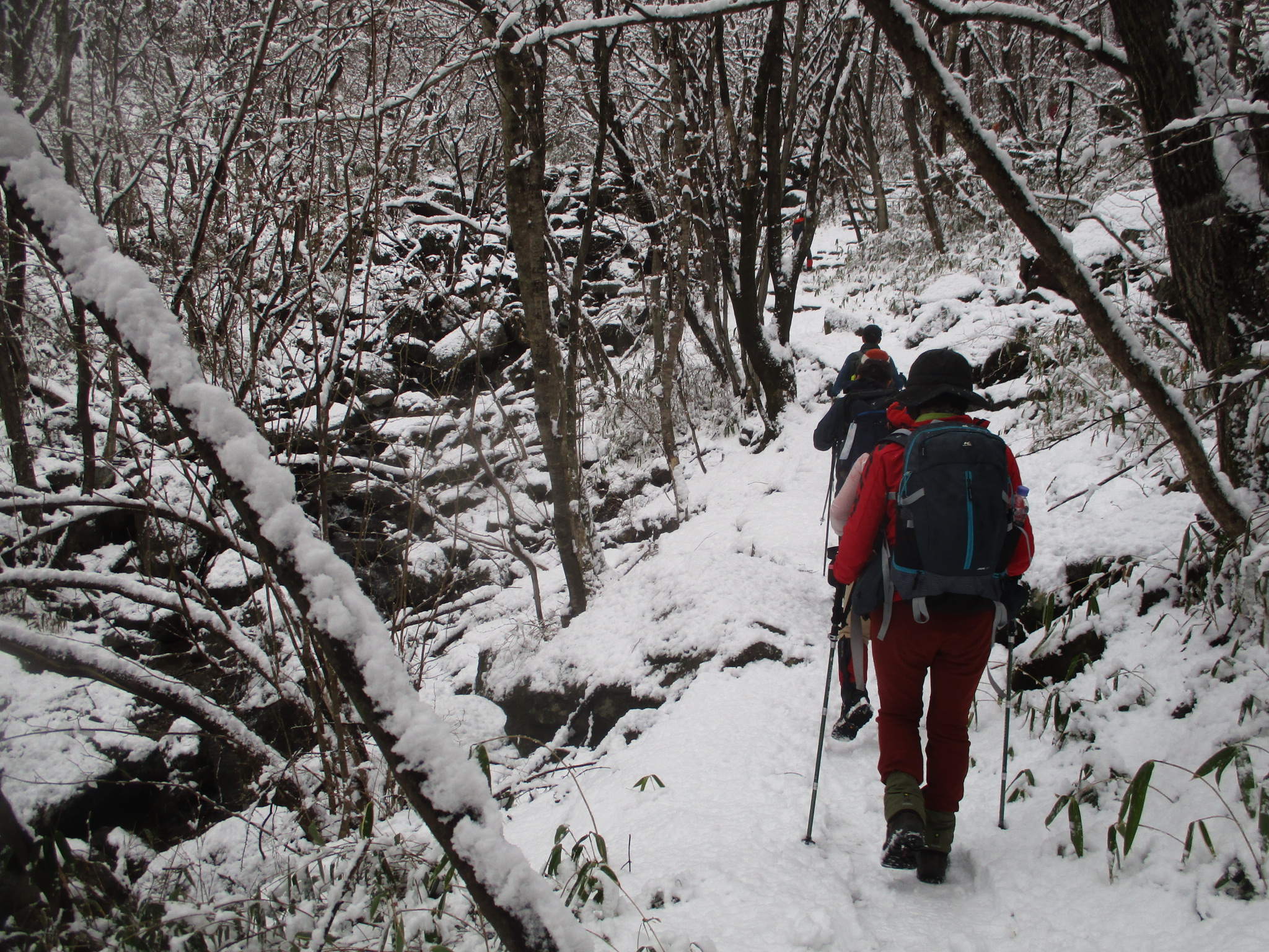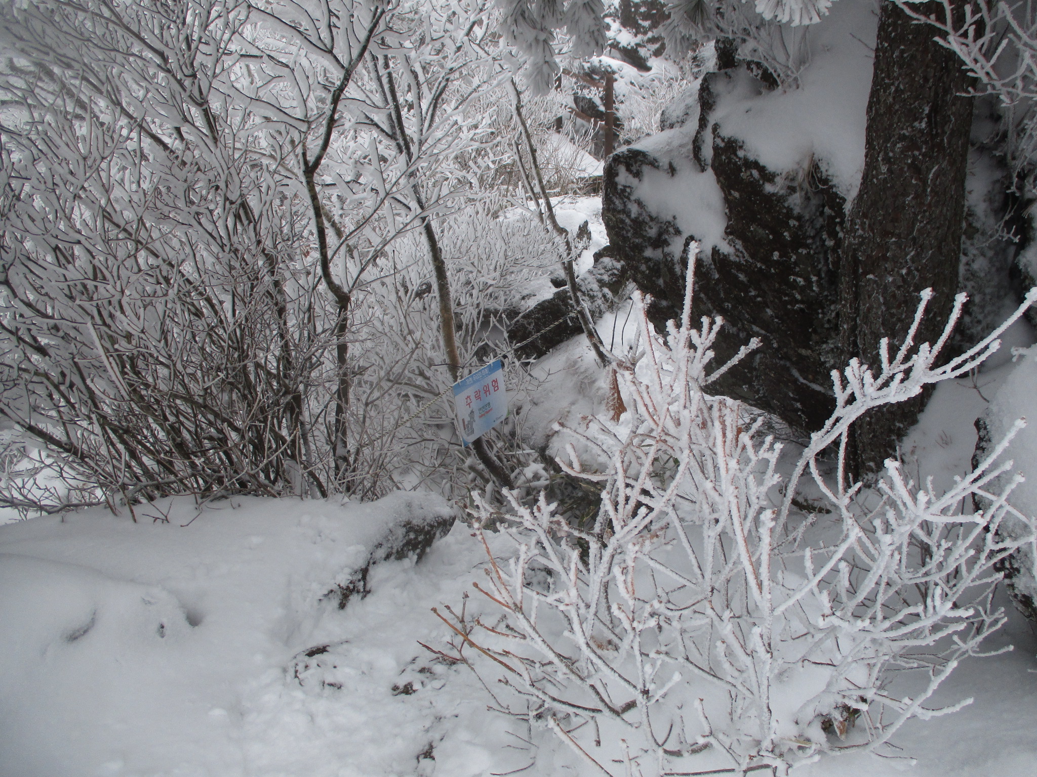 재에서 기다리는 나와 대장한테 곡주 한잔을 얻어묵고 아이젠을 하고 간다!~ 아래쪽에는 눈이 녹아가 나무가지에서