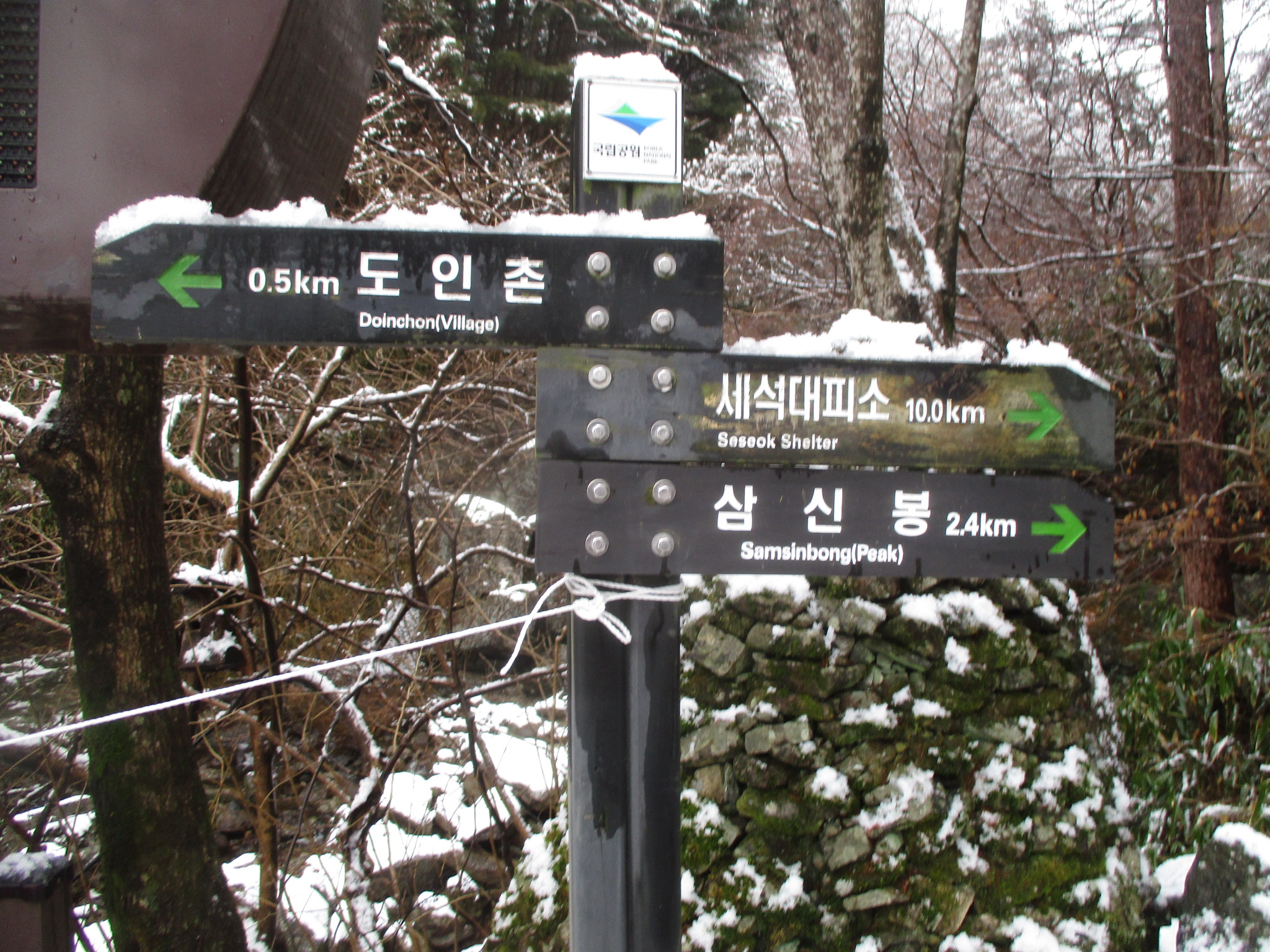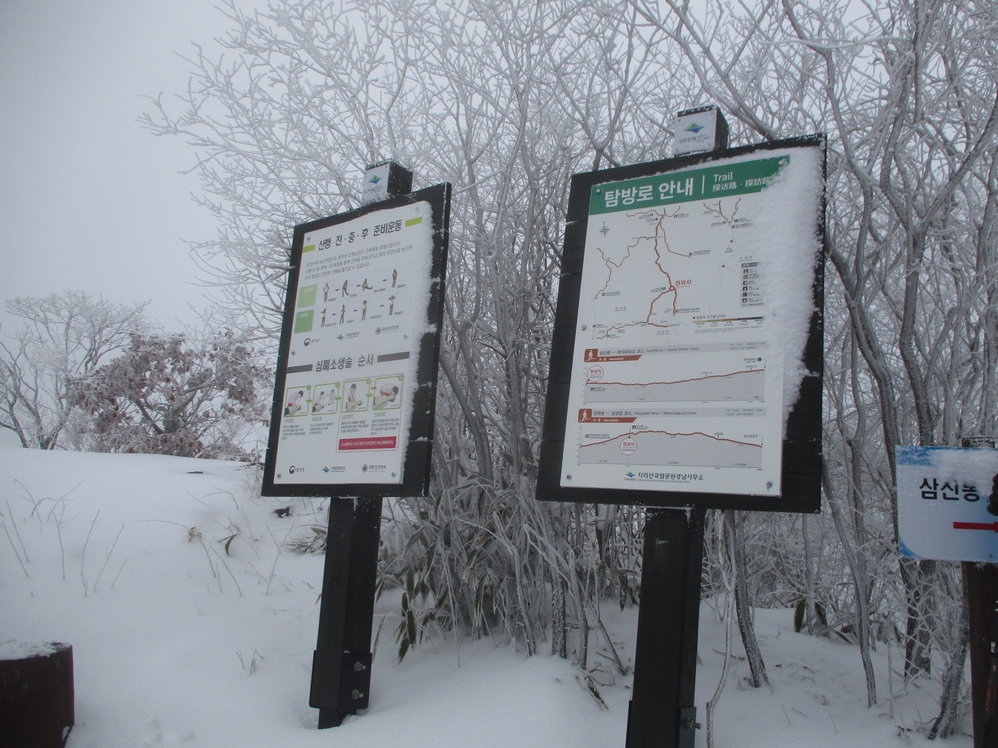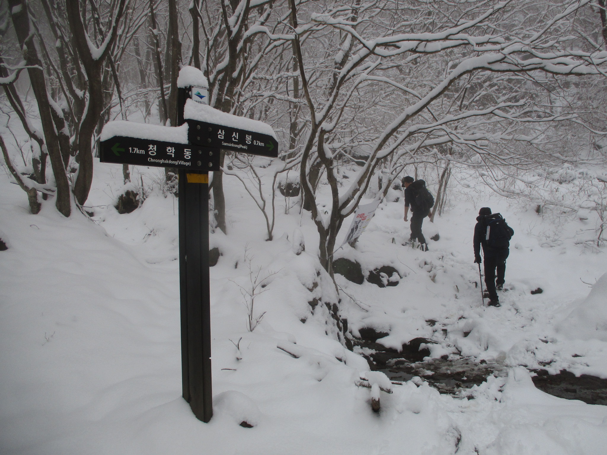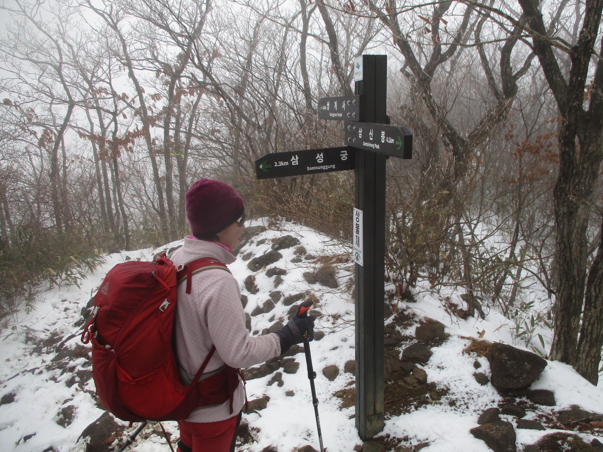 안내판이 보이는 오른쪽으로 들머리가 열리는데 오늘은 눈이 마이 있어가 삼신봉까지는 1시간 정도 걸리지 시푸다!~