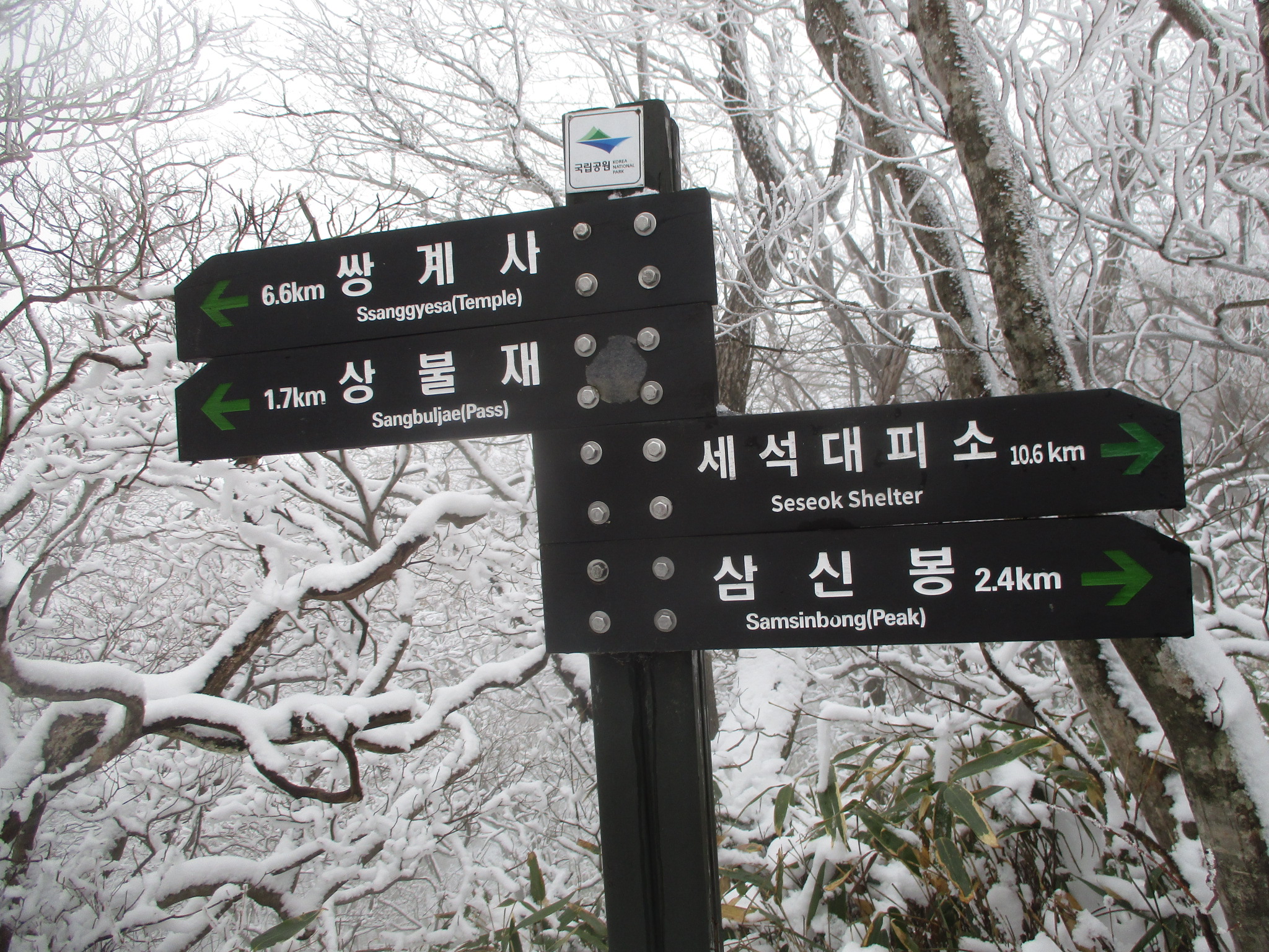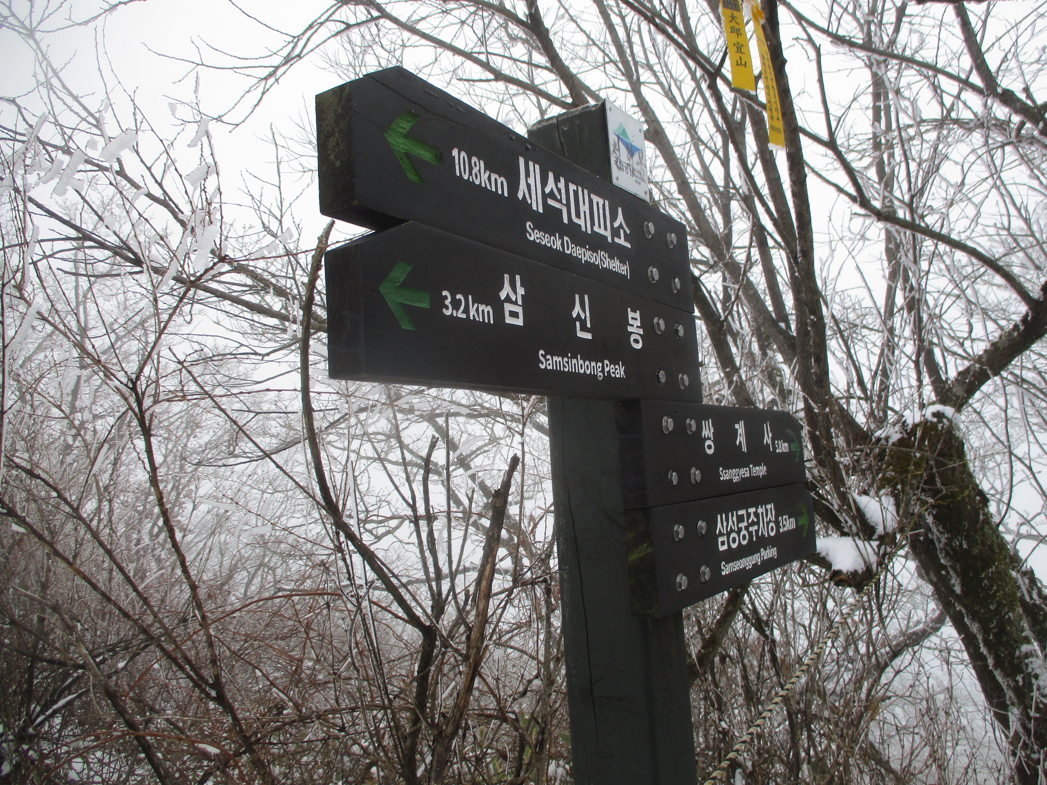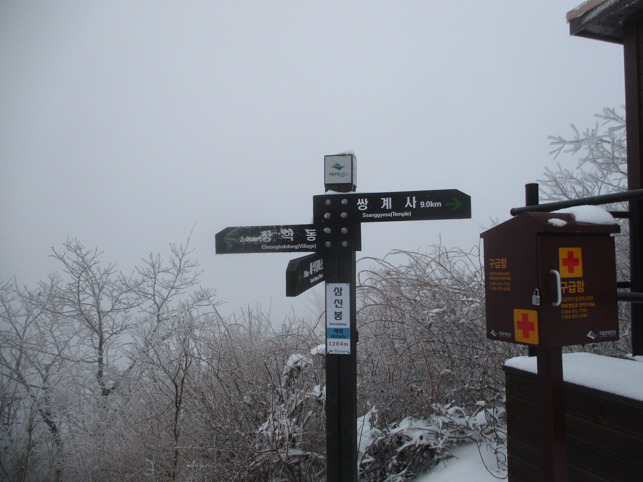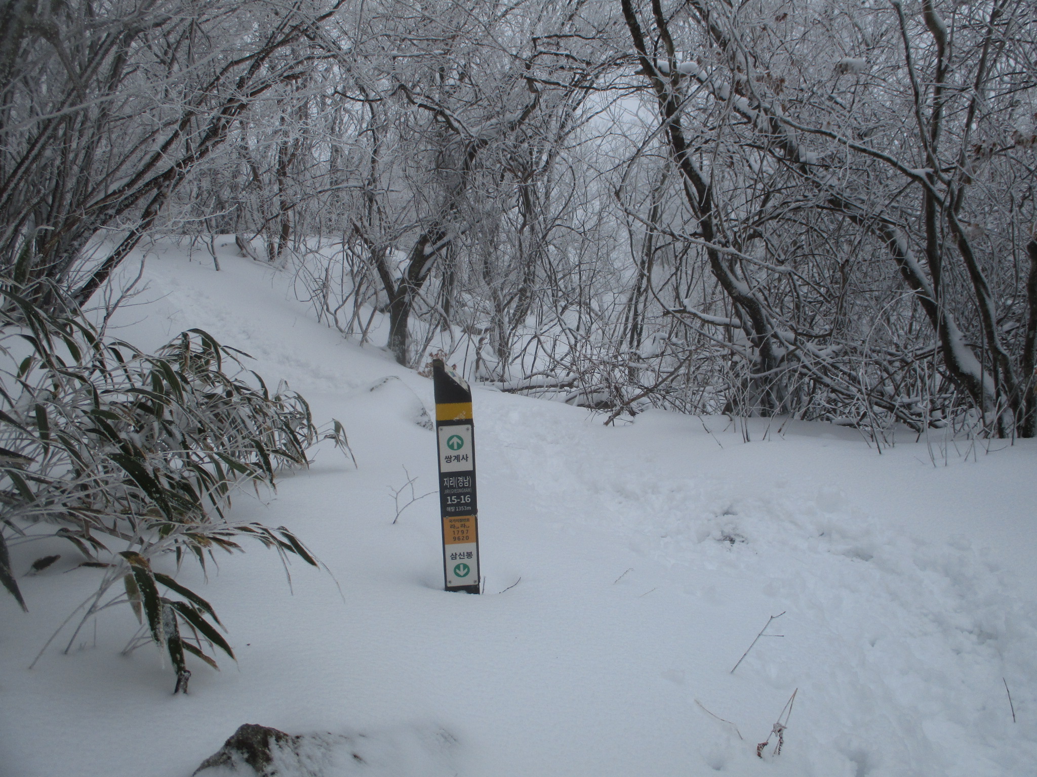 이정표 쌍계사 9.0km 방향으로 가다보마 눈이 바람에 씰린 곳에는 허벅지까지 쌓이가 러셀 자죽에 조시를 잘못 마추마