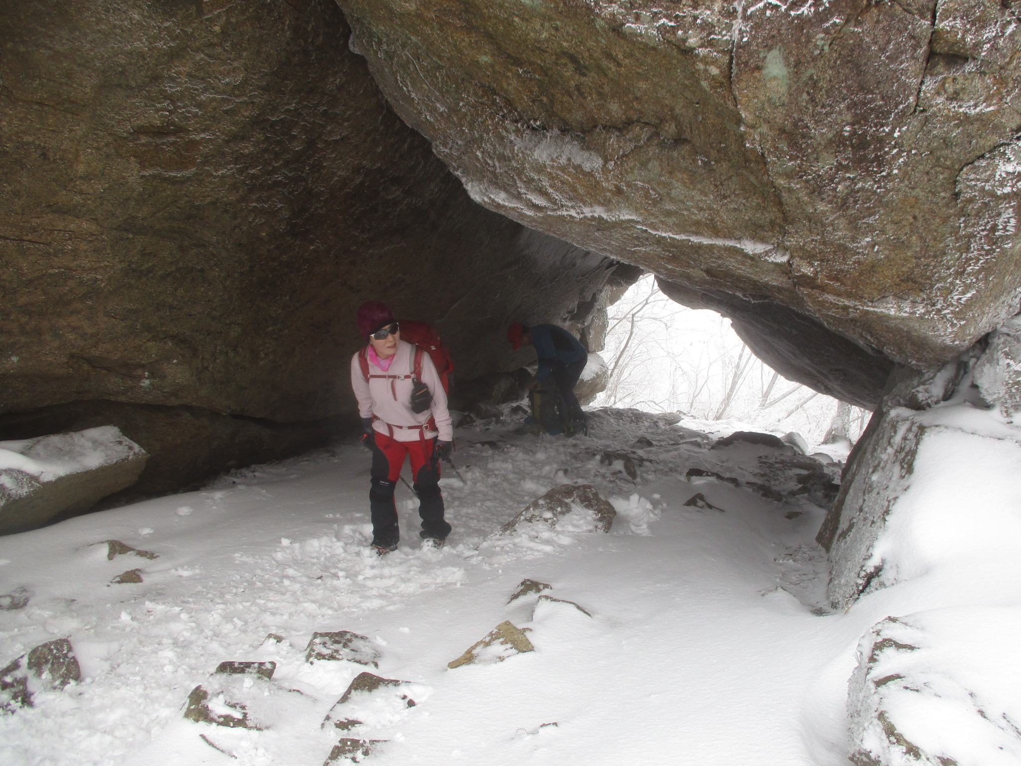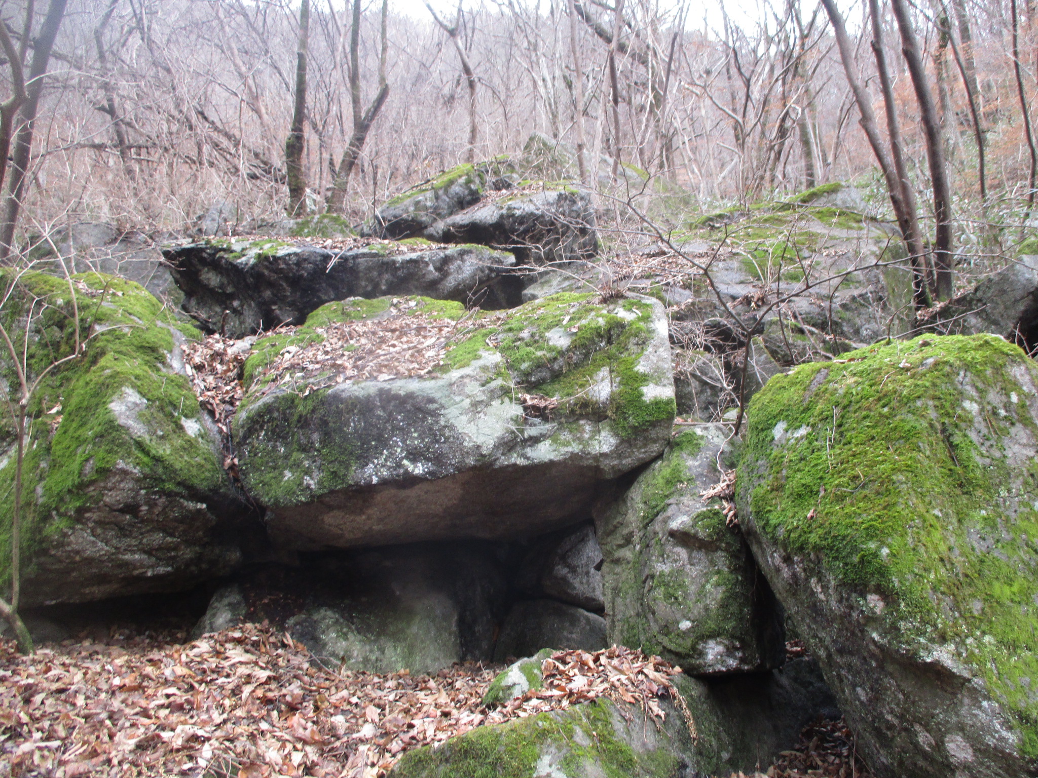 잡목과 서로 엉키가 있는 산죽밭을 빠져 나오마 송정굴이라 카는 앞뒤가 트인 굴을 만나는데 요기를 하고 갈라꼬 들어서이