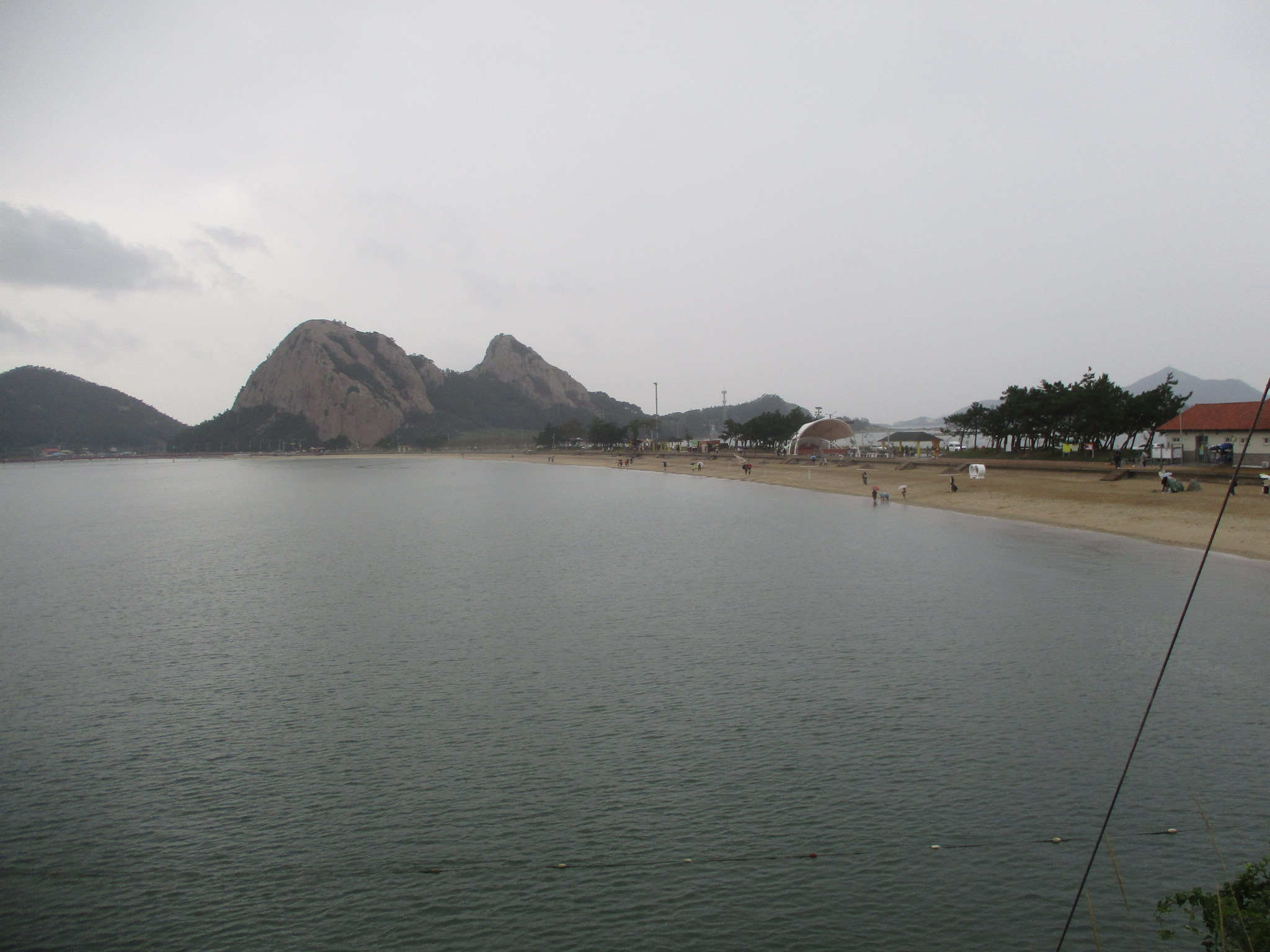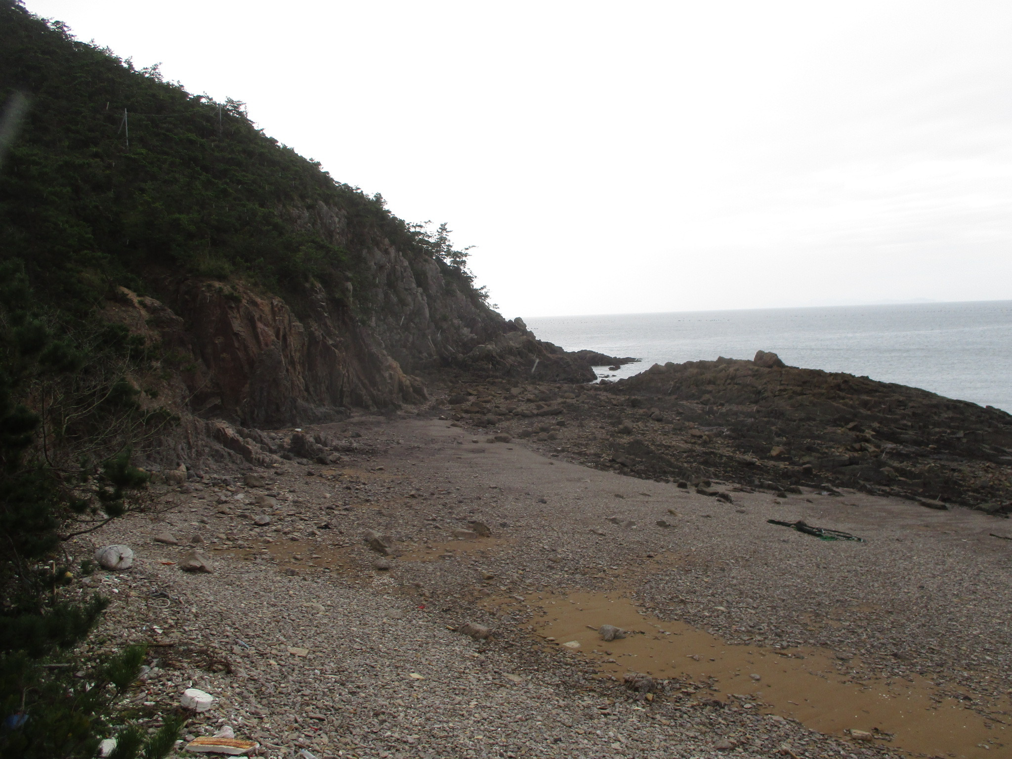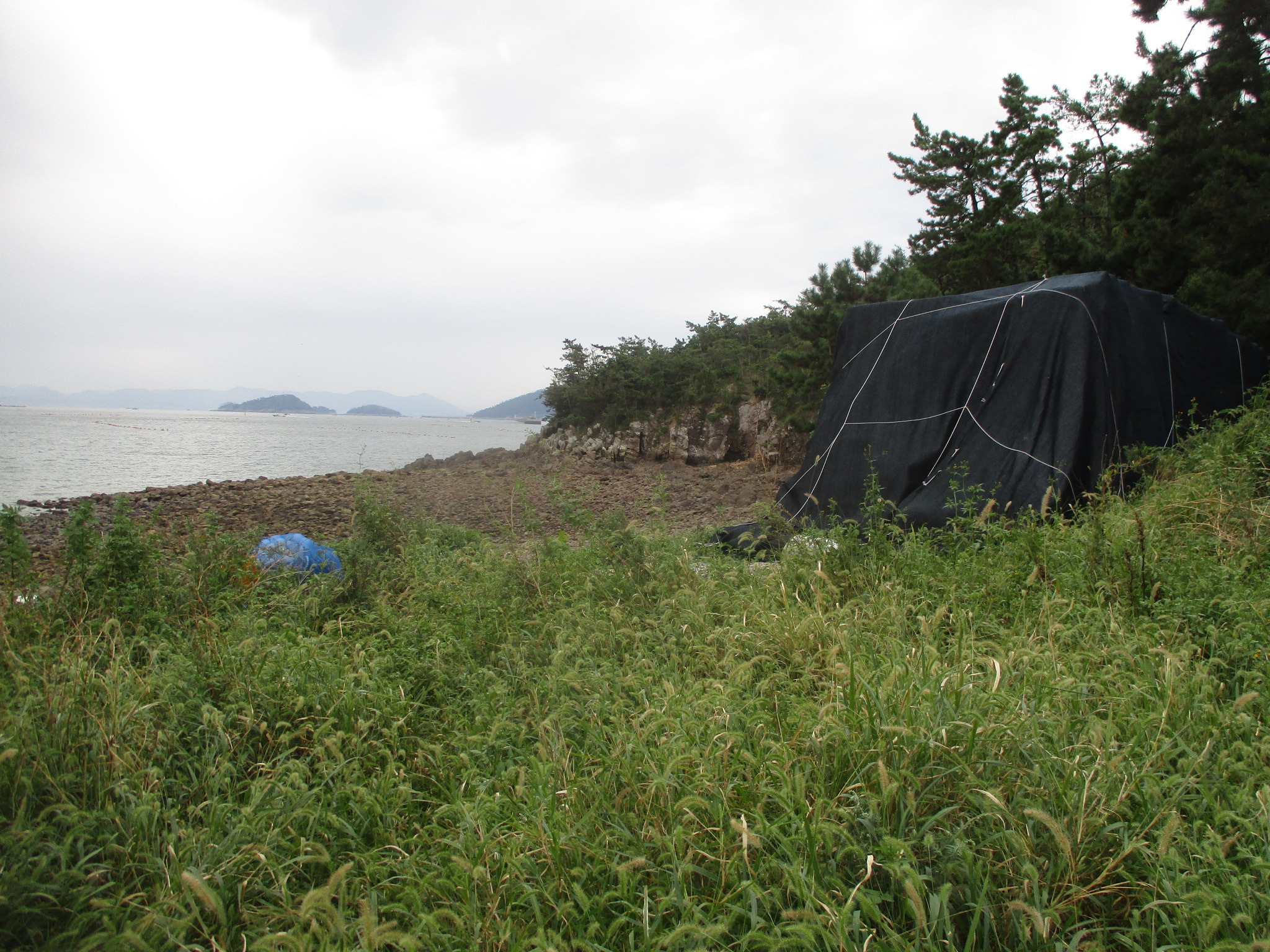 오른쪽으로 터덜터덜 걸어 무녀도 마을회관인 사랑방을 지나 포장도로가 끝나는 지점 왼쪽 해변으로 내리서이 사진에서