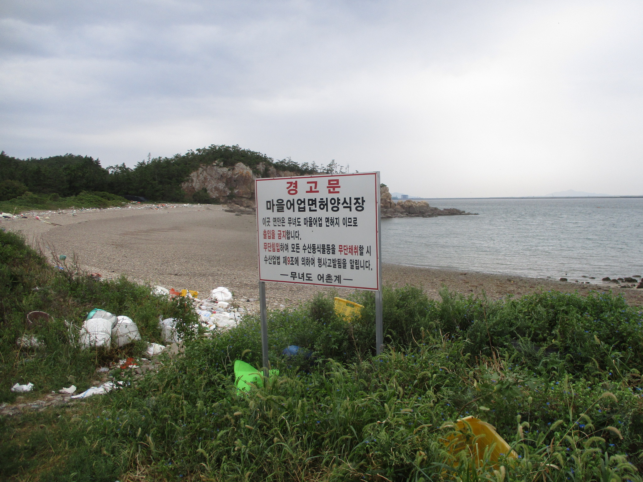 잠시후 갈림길 입구에 '무녀도 어촌계' 저거 양식장이 있시끼네 조개 긋은거를 조가마 고발한다 카미 크다탄 경고판을