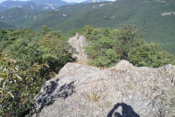 암릉길을 10여m 직진하다가 다시 용각봉으로 되돌아가듯 우측으로 가파르게 꺽여 내려서면
