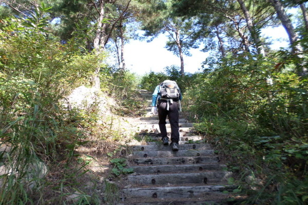 무덤 좌측으로 이어나가면 철도 침목으로 튼튼한 계단을 만들어 놓았다!~