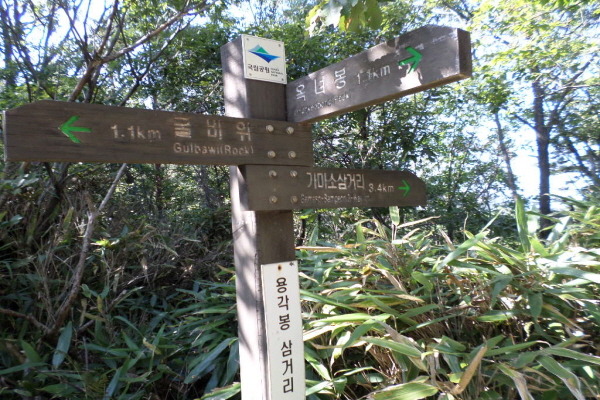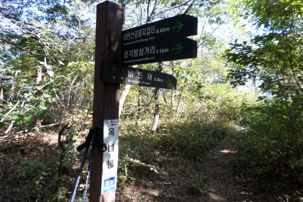 목책을 우측으로 돌아나가면 안부에 이르는데 이정목에는 용각봉 삼거리라고!~