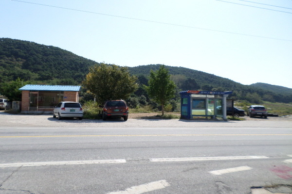 철망이 끝나는 지점을 빠져 나오니 파란 지붕 건물 옆으로 버스 정류장이 보인다!~