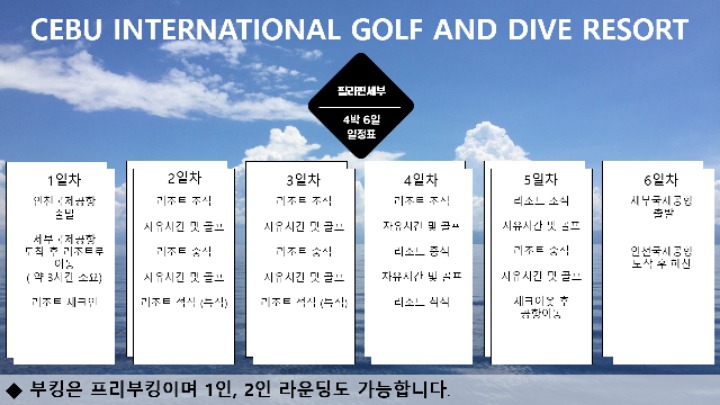 포함사항 : 왕복항공료. 전일정 무제한 그린피 및 숙박, 식사. 부대시설 이용 및 공항 픽업비.