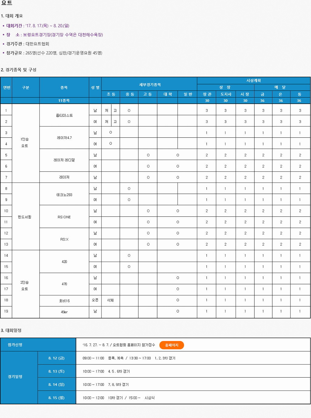 2017 보령 제12회 해양스포츠제전 작성자박두섭|작성시간17.07.25|조회수127 목록 댓글 2 글자크기 작게가 글자크기 크게가 윈드서핑은 테크노 293, RS One, RS-X 만 일부 종목이 있고, 시범종목이나 체험종목에도 없다. 다음검색 현재 게시글 추가 기능 열기 북마크 공유하기 신고 센터로 신고 댓글 댓글 2 댓글쓰기 답글쓰기 댓글 리스트 작성자정든배 | 작성시간 17.07.26 아쉽게도 윈드서핑종목은 한정이 되어 있네요 답댓글 작성자박두섭 작성자 본인 여부 작성자 | 작성시간 17.07.26 9월에 보령에서 제25회 회장배윈드서핑대회가 예정되어 있었는데 광양으로 변경되었습니다. 댓글 전체보기