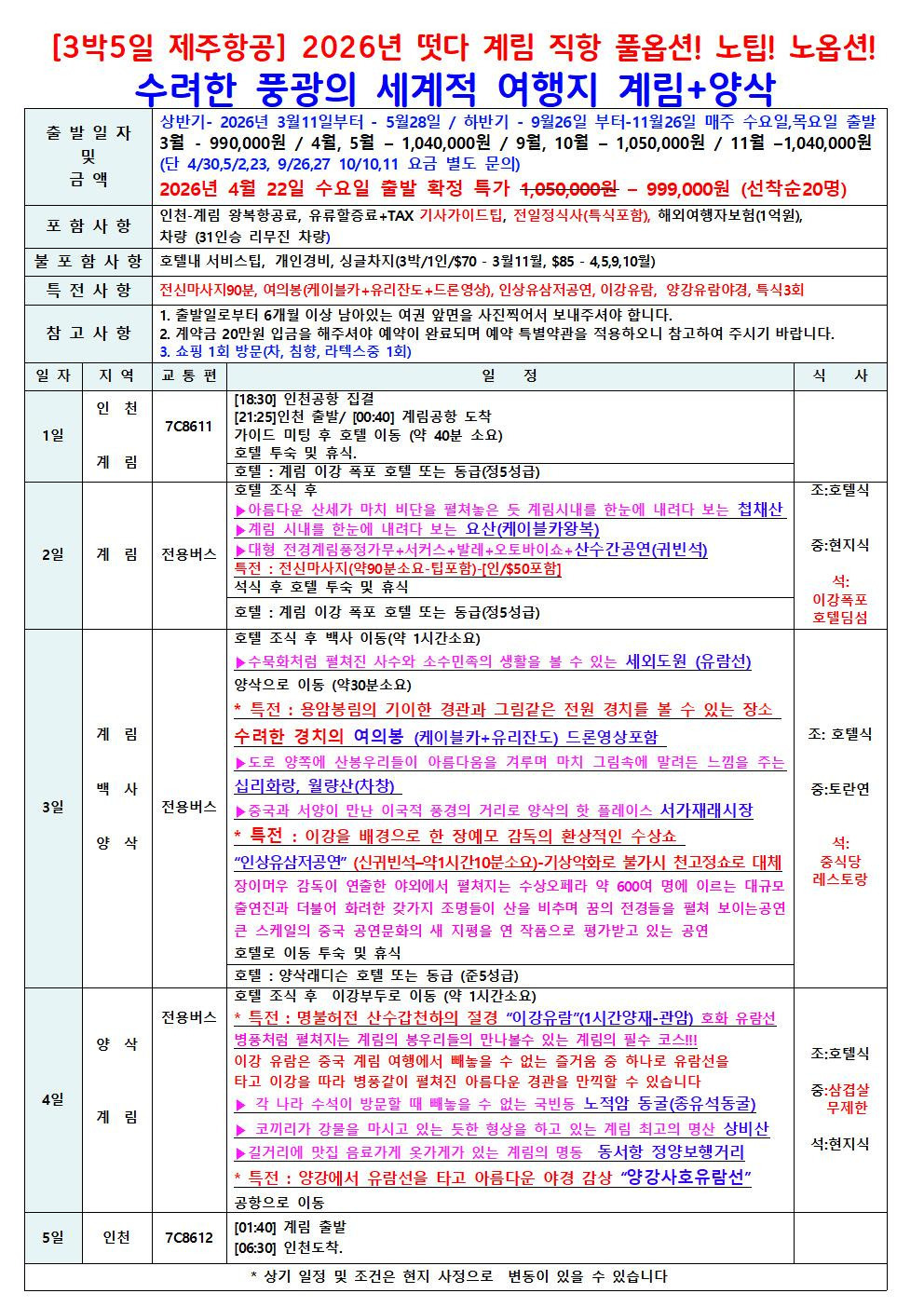 | [2026 제주항공 직항] 계림·양삭 3박5일 풀패키지 노팁✚노옵션✚마사지 포함 진짜 올인 여행! 물안개 스치는 산수화 같은 풍경, 특전 5종까지 포함된 가성비 끝판왕 패키지 지금 오픈합니다 🌿 ✈ 출발일 & 금액 예약/문의📲 010-2581-3579 (3박4일/4박6일 별도날짜가능) 📌 출발 가능 기간 3/11~5/28 (매주수·목) ,9/26~11/26 하반기 일정도 가능 (일부 날짜 요금 별도 문의) 💥 특가 출발일 : 4월 22일(수) → 1,000,000원 선착순 20명 좌석 소진 빠릅니다. 여행은 고민하는 순간 다른 분이 예약합니다. 🟩 3월 : 990,000원 🟩 4~5월 : 1,050,000원 🟩 9월~10월 : 1,050,000원 🟩 4~5월 : 1,040,000원 포함사항 (추가요금 X) ✔ 제주항공 직항 왕복 ✔ 쇼핑1회(한번의 쇼핑으로 부담없이 프리미엄여행을 즐겨요) ⭐ 포함 특전만 봐도 가치 충분! 여의봉 케이블카 + 유리잔도 + 드론촬영/수상오페라 "인상유삼저공연" 이강 호화 유람선/양강사호 야경 유람/전신 마사지 90분 (팁 포함) 특식3회 (이강폭포호텔딤섬,중식당레스토랑,삼겹살무제한) 📌 추가 비용 없이 전부 포함된 진짜 풀옵션 추가 비용 스트레스 없이 그대로! 즐기기만 하시면 됩니다. 🔥 지금 예약해야 하는 이유 📌 가격 오르기 전 특가 선점 가능 📌 좌석 한정 → 대기 발생 가능성 有 📌 여행 계획 미루면 일정/요금 변동 가능 📌 문의만 해두면 선 예약 혜택 적용 👇 여행은 타이밍입니다. 자리는 기다려주지 않아요!! 고민은 가격만 오른다! 지금 문의하기! 예약/문의📲 010-2581-3579(3박4일/4박6일 개별날짜가능 별도문의) https://www.kum1.co.kr/travel/view.html?no=7120&pid=287&rdate=2026-04-22 (홈페이지 일정보기) |