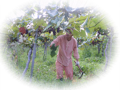 포도나무 주위에 난 덩쿨풀을 제거하고 있습니다.