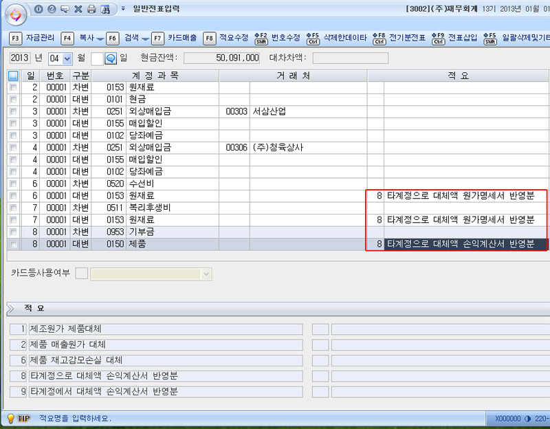 8일 " 8 타계쩡으로 대체액 손익계산서 반영분 " 이렇게 자동으로 뜨는데요~
