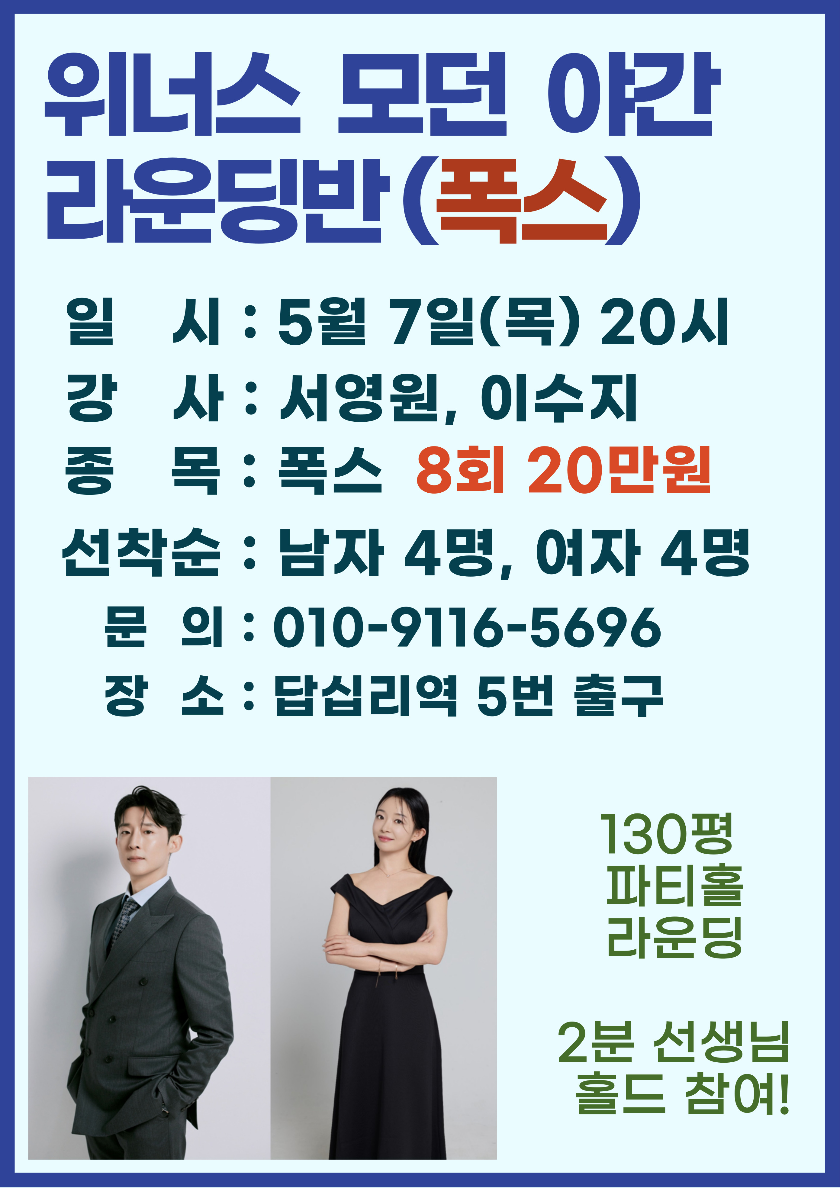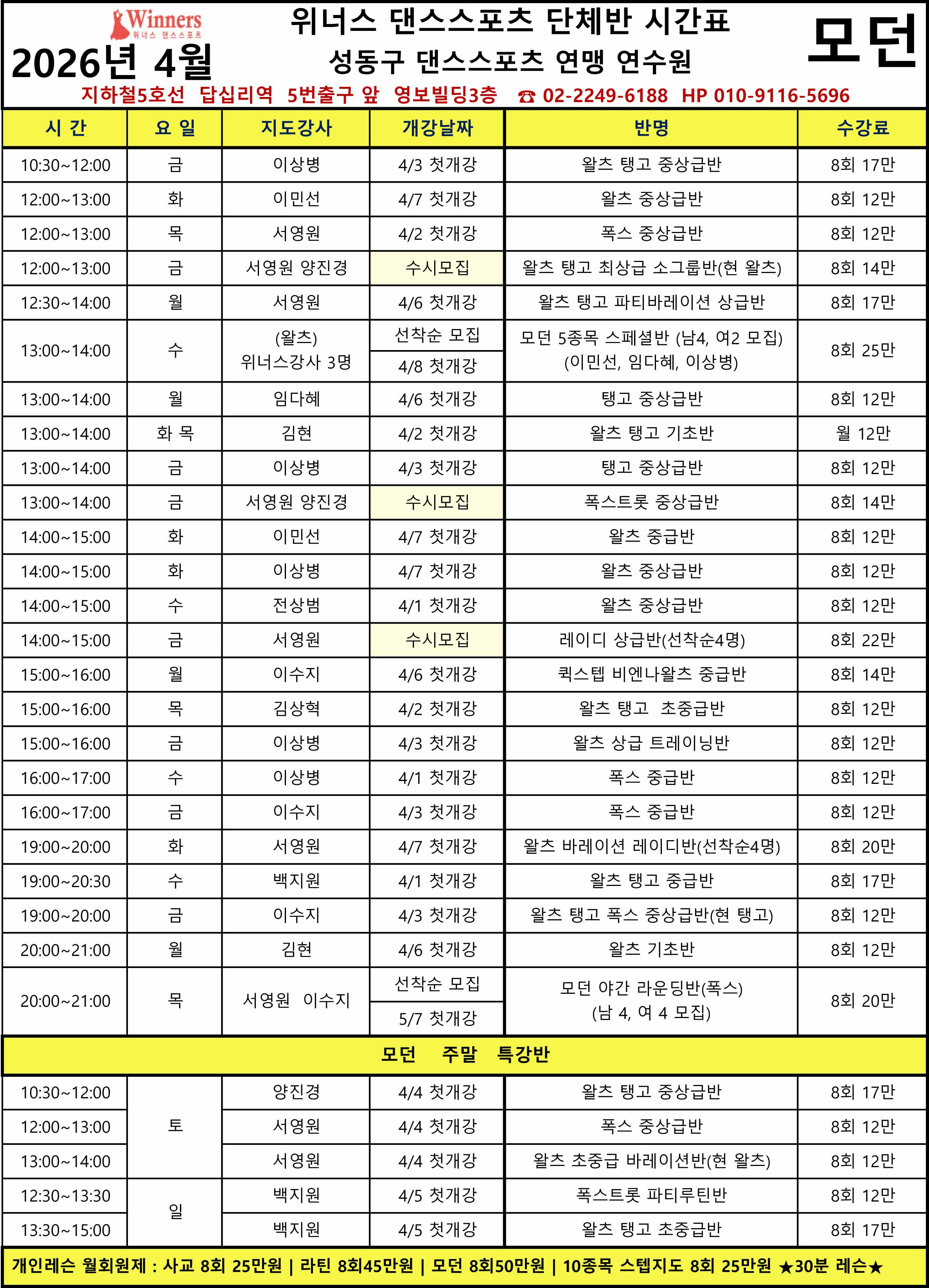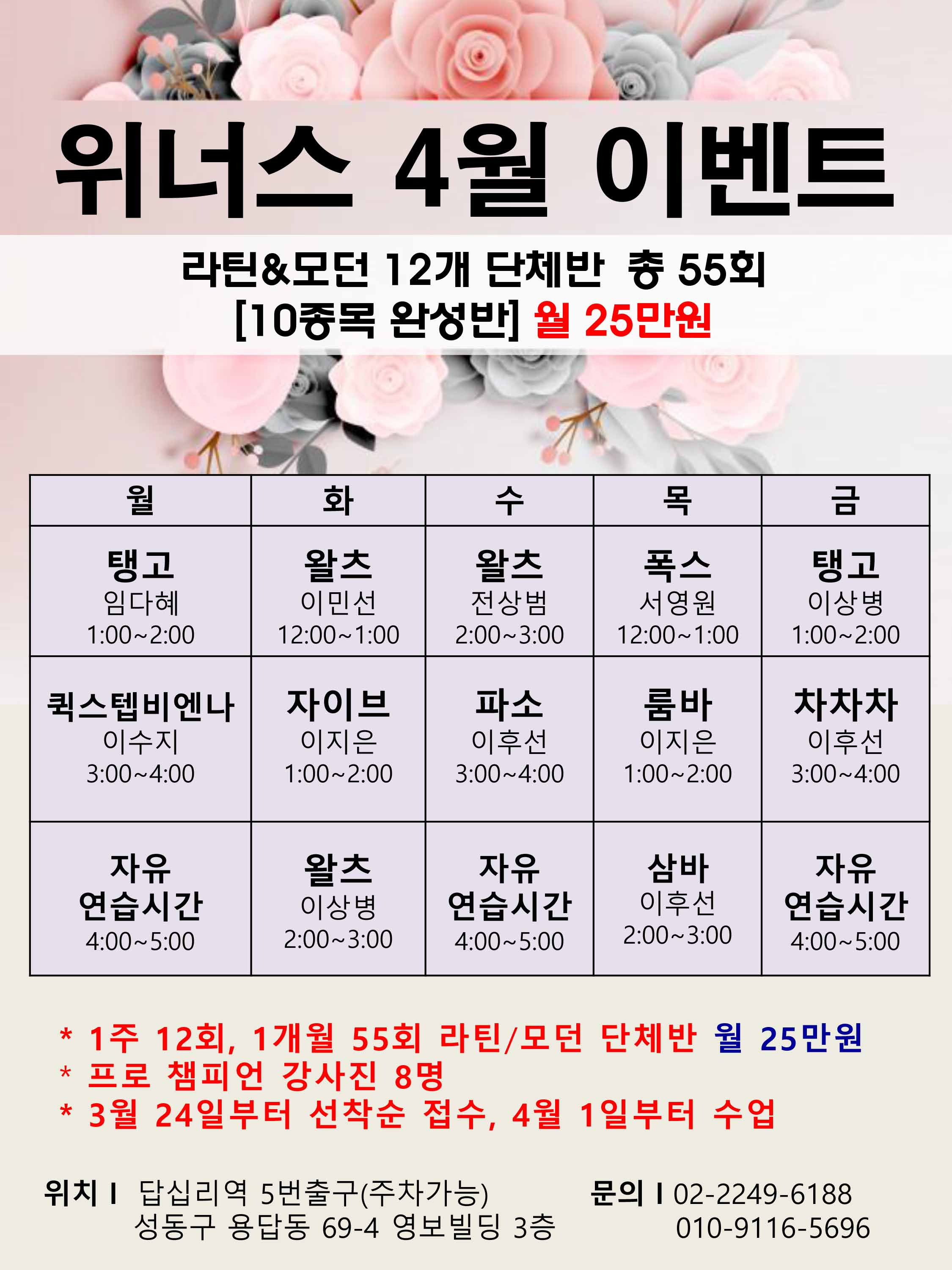 ★위너스 4월 라틴&모던&이벤트 수업 안내★ 작성자전영인(위너스)|작성시간26.03.22|조회수50 목록 댓글 0 글자크기 작게가 글자크기 크게가 다음검색 현재 게시글 추가 기능 열기 북마크 공유하기 신고 센터로 신고 댓글 댓글 0 댓글쓰기 답글쓰기 댓글 리스트