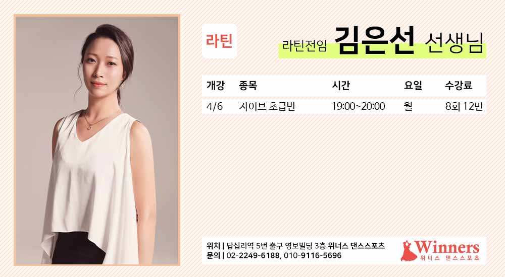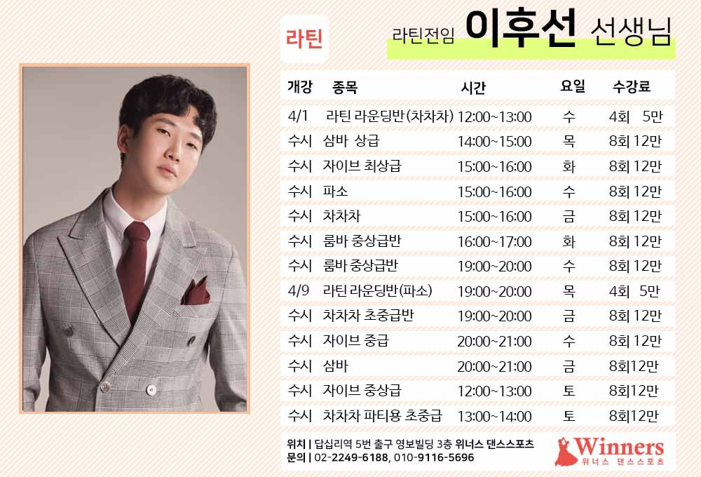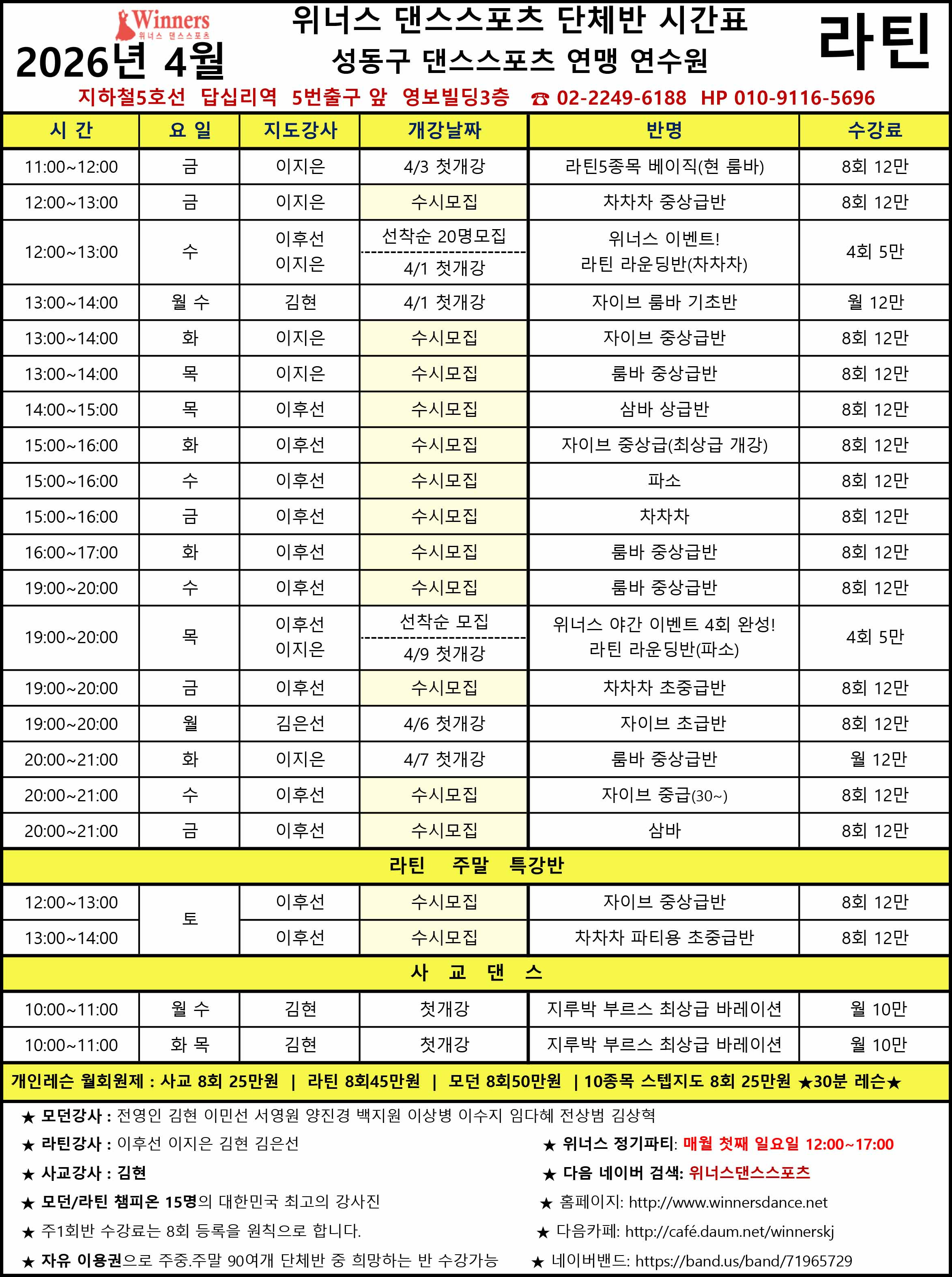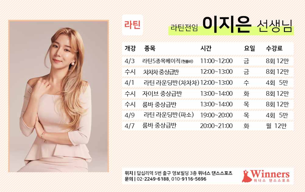 ★위너스 4월 강사별 라틴 수업(답십리역 5번출구)★ 작성자전영인(위너스)|작성시간26.03.22|조회수38 목록 댓글 0 글자크기 작게가 글자크기 크게가 다음검색 현재 게시글 추가 기능 열기 북마크 공유하기 신고 센터로 신고 댓글 댓글 0 댓글쓰기 답글쓰기 댓글 리스트