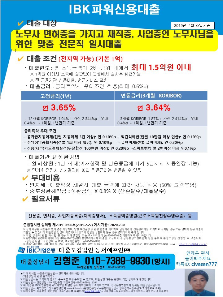 <타행에 있어도 추가로 가능한 IBK 기업은행 노무사님을 위한 맞춤 전문직 신용대출입니다.> 작성시간19.05.02|조회수142 목록 댓글 0 글자크기 작게가 글자크기 크게가 다음검색 현재 게시글 추가 기능 열기 북마크 신고 센터로 신고 댓글 댓글 0 댓글쓰기 답글쓰기 댓글 리스트