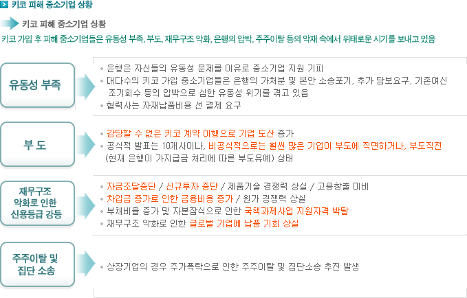 한편, 대표적으로 파생금융상품(통화옵션상품)인 ‘키코(KIKO)’ 사태로 인해 건실한 중소기업들이 흑자도산한 예가 있습니다.