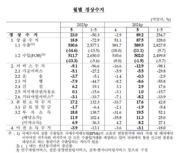 한국은행이 5일 발표한 국제수지 잠정통계에 따르면 지난 5월 경상수지는 89억2천만달러(약 12조3천270억원) 흑자로 집계됐습니다.