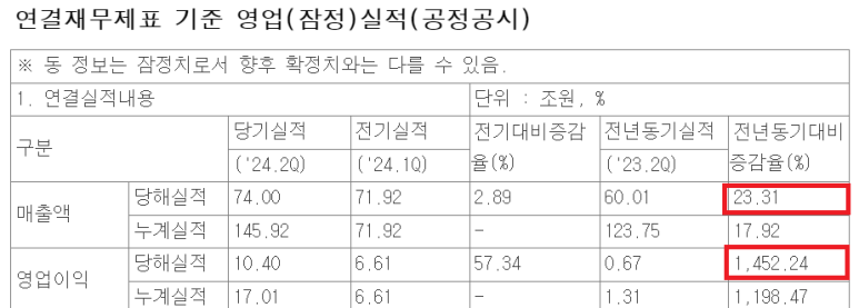 연결 기준 올해 2분기 매출액은 74조원으로 작년 동기 대비 23.31% 증가했습니다.