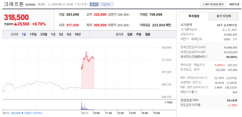 이처럼 크래프톤이 주목할 만한 실적을 거두자, 주가는 30만원 선을 뚫으며 주가가 폭발적인 상승세를 보이고 있습니다.