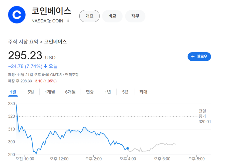 하늘 높은 줄 모르고 우상향하던 코인베이스의 주가에 제동이 걸렸습니다.