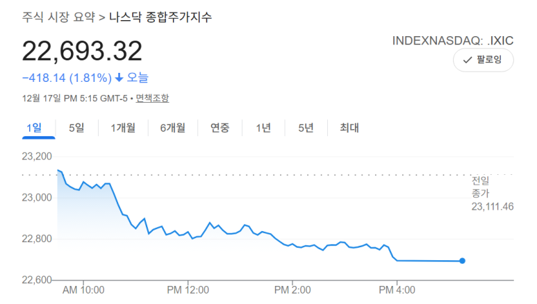 이렇게 성장가도를 달리던 AI 관련주들이 급락하자 나스닥 역시 또 크게 하락하며 22000선까지 다시 내려온 상황입니다.