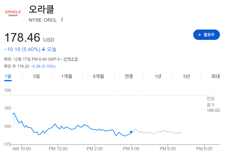 오라클 데이터센터의 핵심투자자가 빠진다는 소식이 전해지자, 오라클의 주가는 큰 폭으로 하락했습니다.