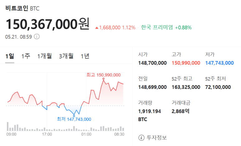 트럼프 관세 여파 이후 부진함을 보이던 비트코인이 다시 1억5천만원을 찍었습니다.