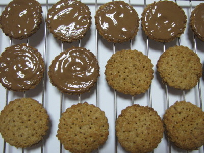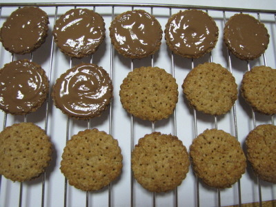 초콜릿을 녹여서 비스킷 뒷면에 발라준다...