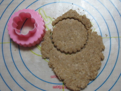 밀대로 반죽을 밀어서 모양깍지로 모양을 찍어낸다