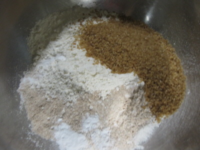 유기농통밀가루,중력분,베이킹파우더,베이킹소다,유기농흑설탕,소금을 넣고 섞는다