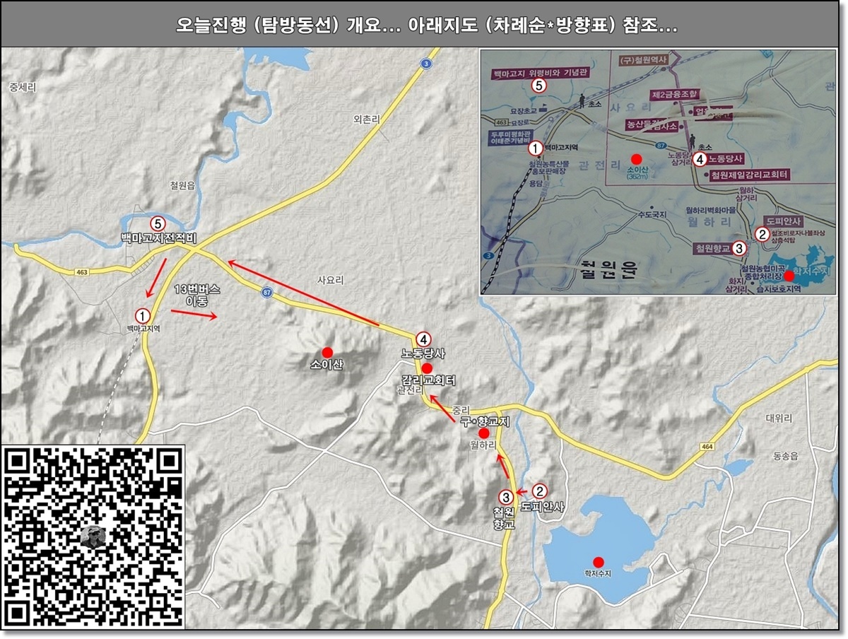 산행코스: [ 백마고지 입구 버스 정류장 ~(0.7km)~ 백마고지 전적지 ~(4.5km)~ 소이산 전망대 ~(0.9km)~ 노동당사 ~(3.1km)~ 도피안사 ~(0.7km)~ 철원향교 ~(0.2km)~ 도피안사 버스 정류장 ] (10.1km)