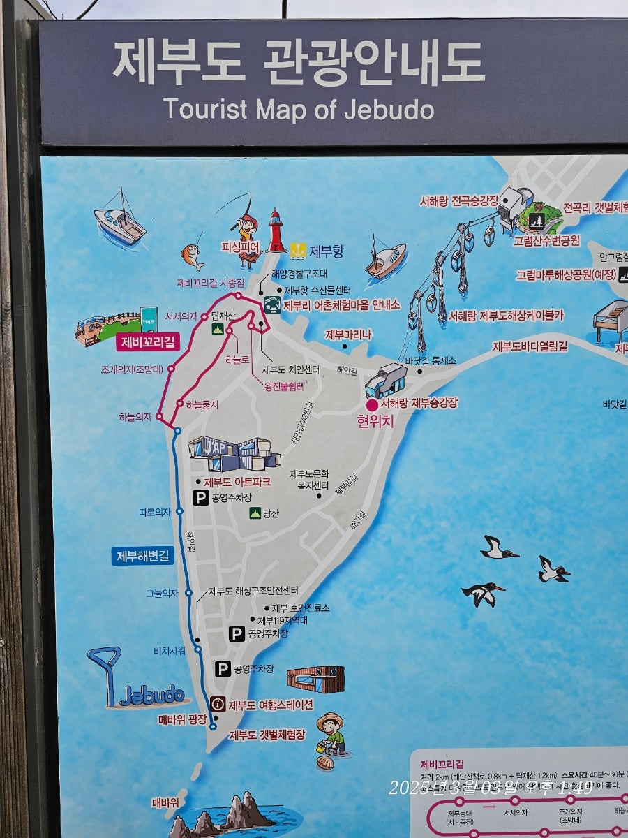 여의도 면적의 4분의 1도(0.9제곱킬로미터) 안 되는 섬이지만 길이 1.4km의 천혜의 백사장을 지니고 있고, 화성 실크로드 길에 속해 있는 제부 꼬리 길이라는 트레킹 코스가 제부도의 명물로 자리 잡았다. 우선 유명하다는 제부도의 트레킹길을 걷기 위해 출발지인 제부 어촌체험마을로 발길을 옮겼다. 규모가 워낙 작은 섬이라 전체가 평지로 구성될 것만 같지만 섬의 중심부엔 당산이 있고, 서북부엔 가장 높은 산인 탑산이 자리한다. 탑산은 해안가와 바싹 붙어 그곳을 지나가긴 힘든 일이었지만 절벽길을 따라 걸어가는 길이 생기면서 제부도에 방문하면 꼭 가봐야 할 필수코스로 자리매김하였다.