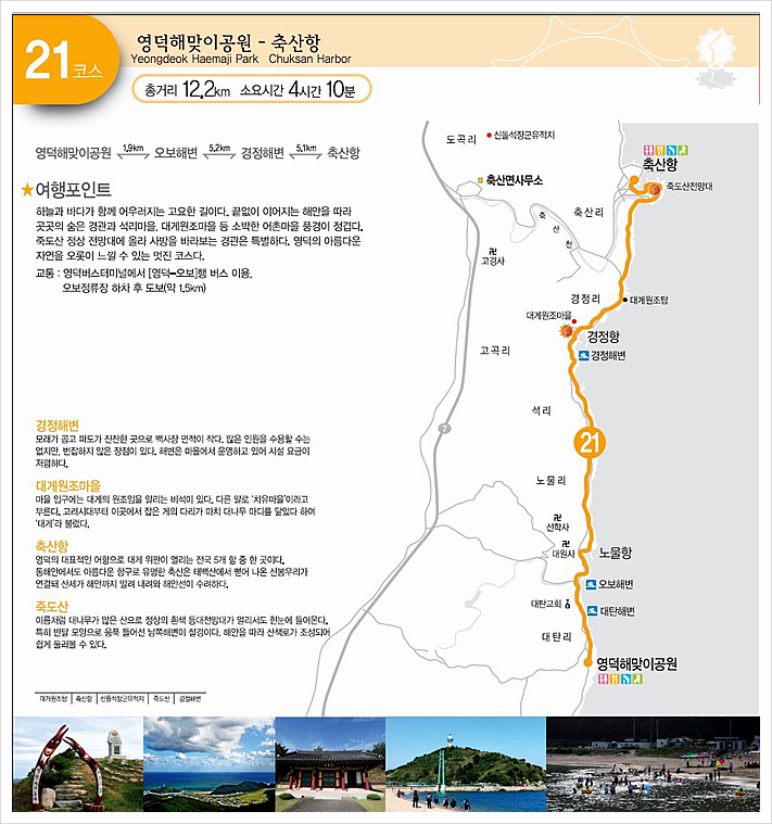 경정2리에서 축산항까지의 4km 구간은 해안경계를 서는 군인들이 오가는 길이라고 해서 일명 ‘초병의 길’로 불린다. 그러고 보면 21코스의 대부분은 민간인들이 다니지 못한, 군인들만 알던 꽁꽁 숨겨 두었던 길로 이어진 셈이다. 아직도 완전하진 않지만 그 진주 같은 길을 걸을 수 있는 것이 참으로 다행스럽다.