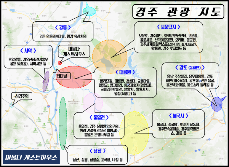 황리단길에서 도보 5~7분, 시내와 접근성이 좋아 뚜벅이 코스로도 인기입니다.