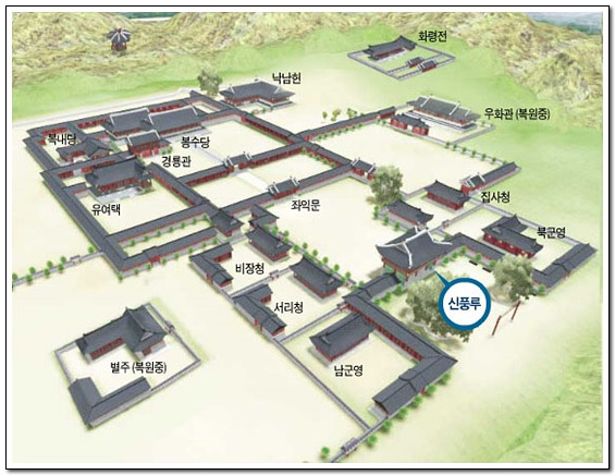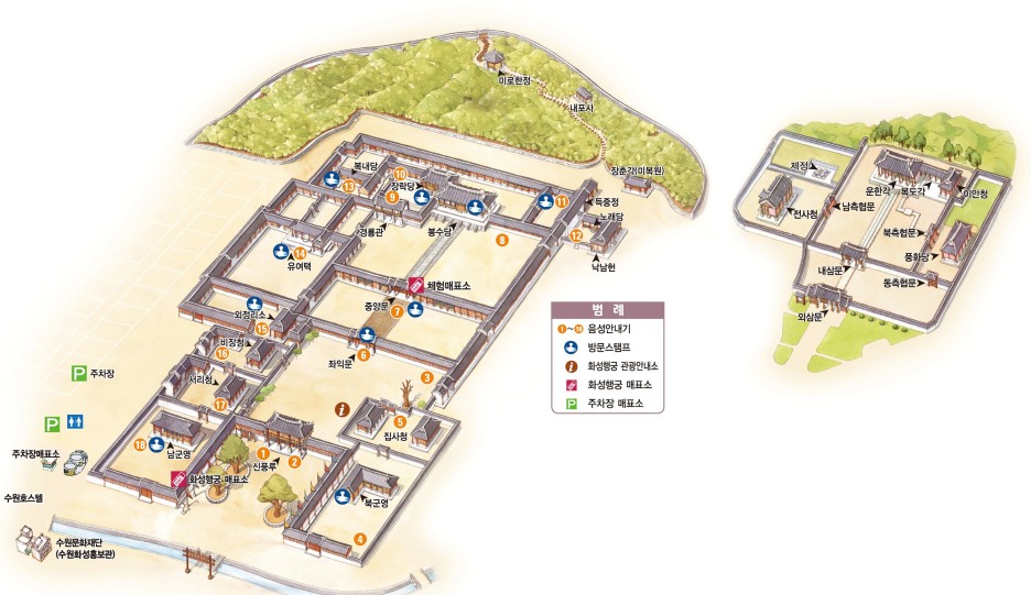 정문인 신풍루 양쪽으로 남군영과 북군영이 있으며 신풍루로 들어서면 왼쪽으로는 서리청과 비장청, 오른쪽으로는 집사청이 위치해 있다. 서리청과 비장청, 집사청을 좌우로 지나 마당을 가로지르면 좌익문이 있고, 이를 통과하면 중앙문이 나온다. 이 중앙문을 지나면 화성행궁의 정전인 봉수당이 나타난다. 화성행궁과 따로 떨어져 있는 화령전은 정조의 어진(御眞) 즉 초상화를 모시고 제사를 지내던 곳이다. 조선시대에는 왕의 어진을 모신 사당을 전국 여러 곳에 뒀다. 지금은 전주 경기전과 개성 목청전, 창덕궁 선원전, 수원 화령전만이 남아있다. 정조가 세상을 떠난 이듬해인 1801년(순조1) 화성행궁 옆에 화령전을 짓고 현륭원 재실과 창덕궁 주합루에 모셔져 있던 어진을 옮겨와서 봉안했다. 화령전은 정전인 운한각을 중심으로 이안청, 복도각. 재실, 전사청과 향대청 등을 갖추고 내·외삼문까지 구비했다. 당대 최고급 기술자들이 참여해 약 2개월이라는 짧은 시간에 완성했다. 현재 전사청 등 일부 공간은 복원했으나 전체적으로 원형이 잘 남아있다.