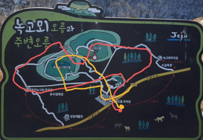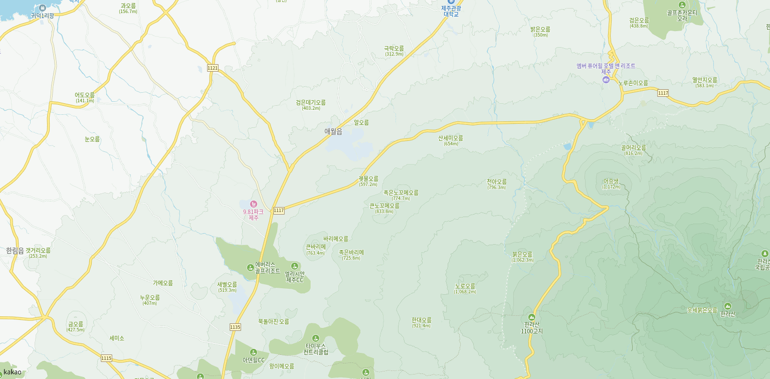 제주경마공원 윗길인 1117번 도로를 가보면 노꼬메주차장으로 가는 농로가 숨어 있다. 차량 내비게이션으로는 노꼬메주차장을 검색하면 안내를 잘해 준다. 제주도 현지인들이 고사리를 뜯으러 오는 곳이다. 노꼬메는 높은 뫼라는 뜻인데 한자로는 고고산(高古山)이라고 했고, 노꼬메를 음차하여 녹고산(鹿高山)이라고도 불렀다지만, 지금은 순우리말 정겨운 이름인 노꼬메로 부르고 있다. 바로 옆에 작은노꼬메가 있어, 큰노꼬메로 구분하기도 한다.