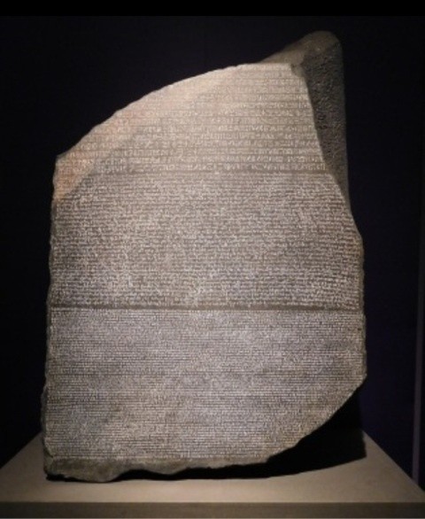 대영박물관의 명실상부한 간판급 유물이자 가장 유명한 유물. 1799년 7월 15일에 프랑스 육군 중위가 발견한 것을 후일 영국이 가져와 연구했으며, 이후 언어학자인 샹폴리옹이 로제타석을 통해 베일에 싸여 있던 히에로글리프 해독법을 깨우치면서 대대적으로 유명세를 타게 된다. 내용은 대략 프톨레마이오스 왕조의 프톨레마이오스 5세가 사제들에게 은혜를 베푼 것을 찬양하는 내용이지만 똑같은 내용이 히에로글리프, 민중문자, 그리스 문자로 3번씩이나 반복해서 쓰여 있어서 비교 대조를 통해 해독을 할 수 있었다.