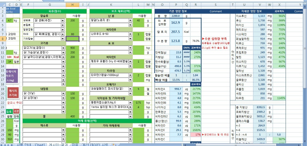 먼저 캣츠 인포의 엑셀 파일을 이용하여 육류 및 뼈비율, 영양제 등을 입력합니다.